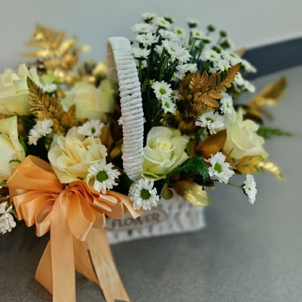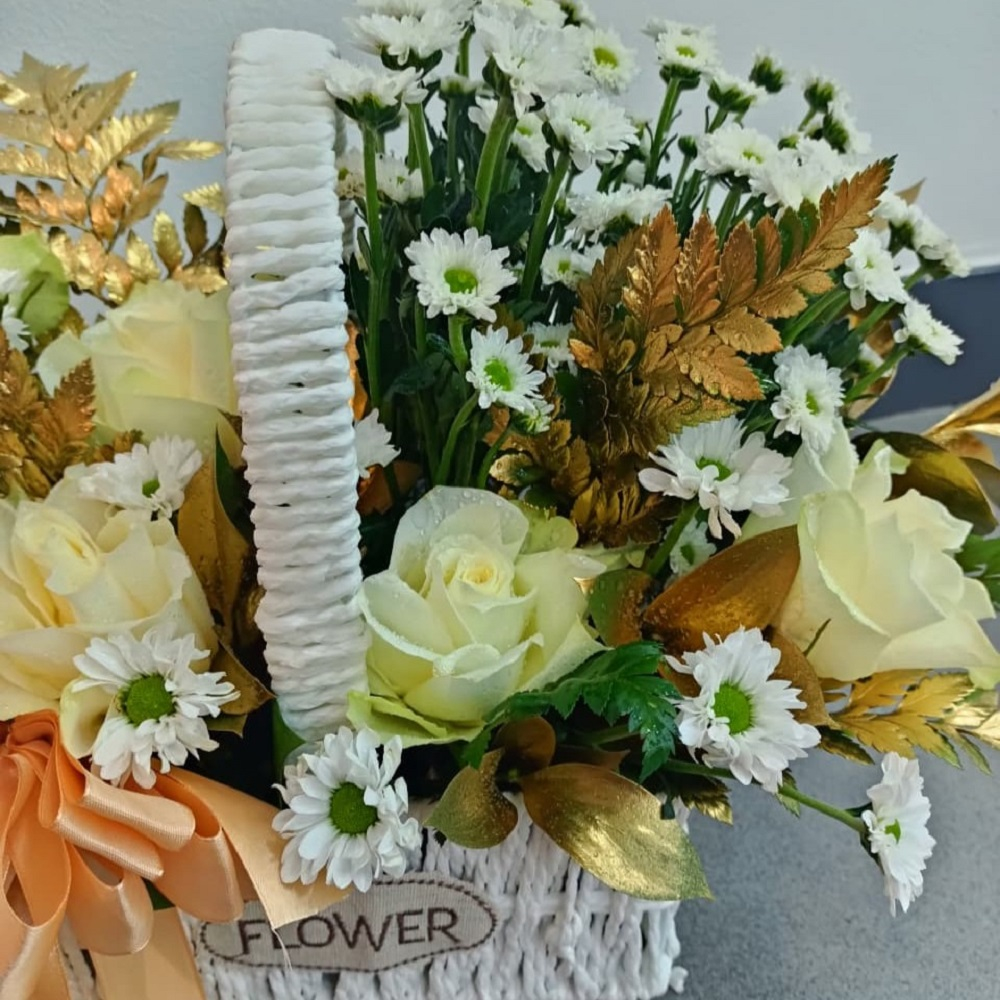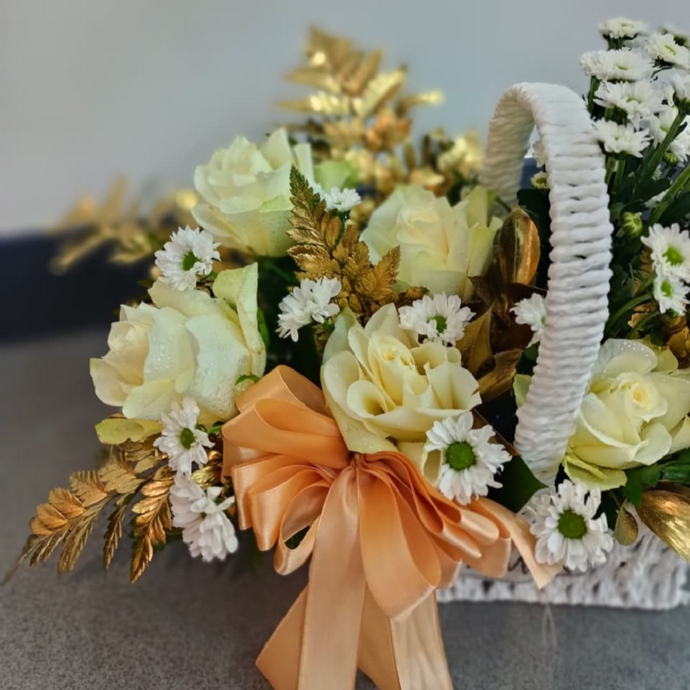 تنسيق أنيق مقدم في سلة خوص بيضاء ناصعة. يتميز بمزيج رائع من زهور الجوري والكريز، مع لمسات درامية من أوراق الشجر والسراخس المطلية باللون الذهبي. يكمل التنسيق بفيونكة ساتان. هذا التصميم الإحتفالي الفاخر مثالي للتهنئة أو التعبير عن التعاطف الراقي.