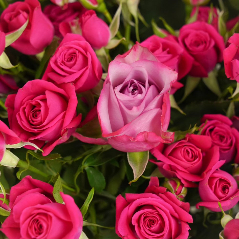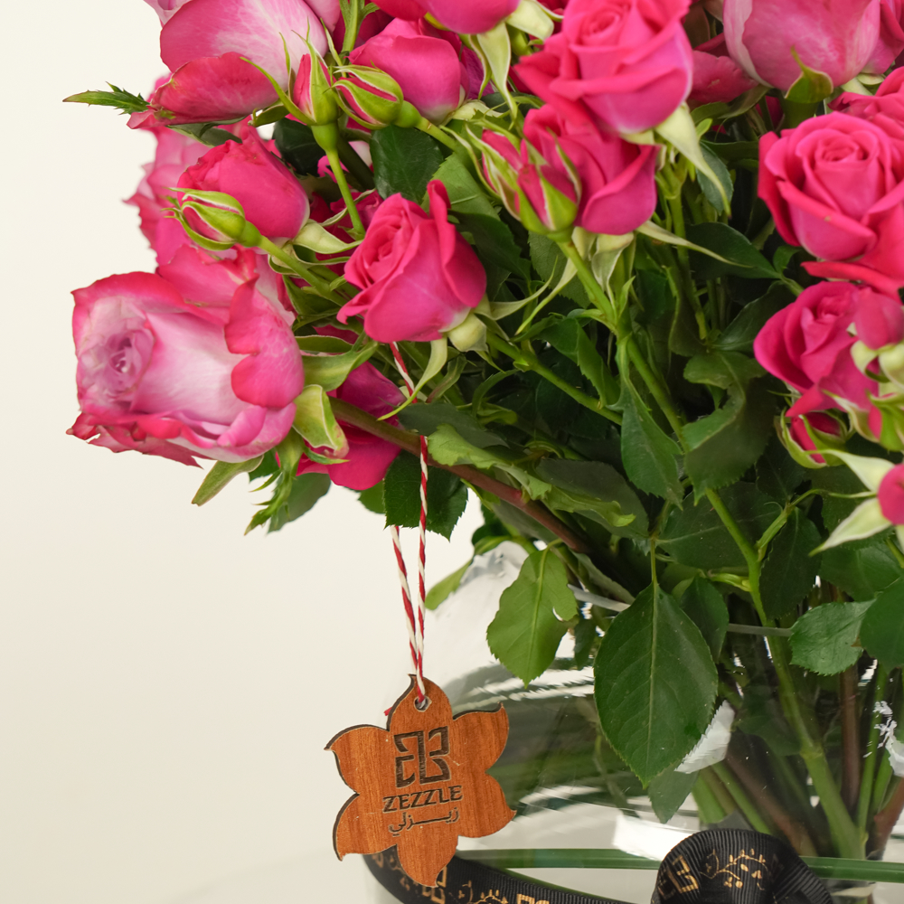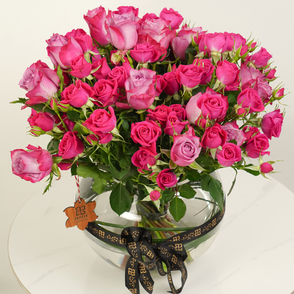 تنسيق فاخر يضم الجوري والبيبي جوري في وعاء زجاجي. هذه الباقة مزيج من الفخامة والجاذبية، وهو الهدية المثالية للتعبير عن الحب أو الإعجاب أو الإحتفال.