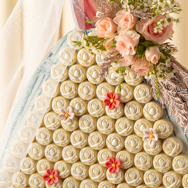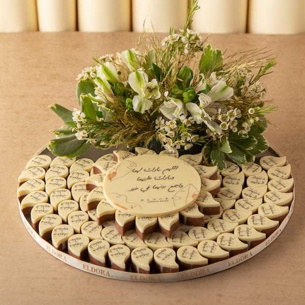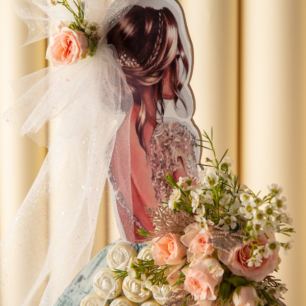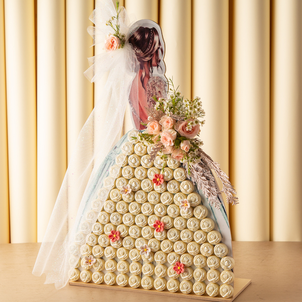 ستاند خشب على شكل عروسة مزين بالزهور الطبيعية يحتوي على 1.250 كيلو حلو قهوة.