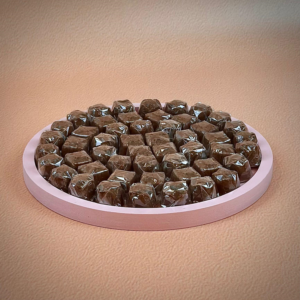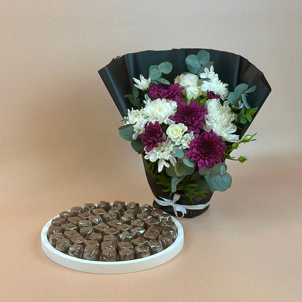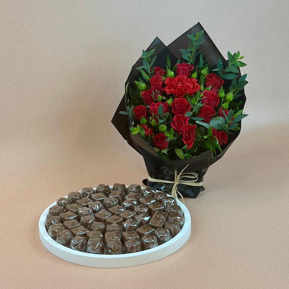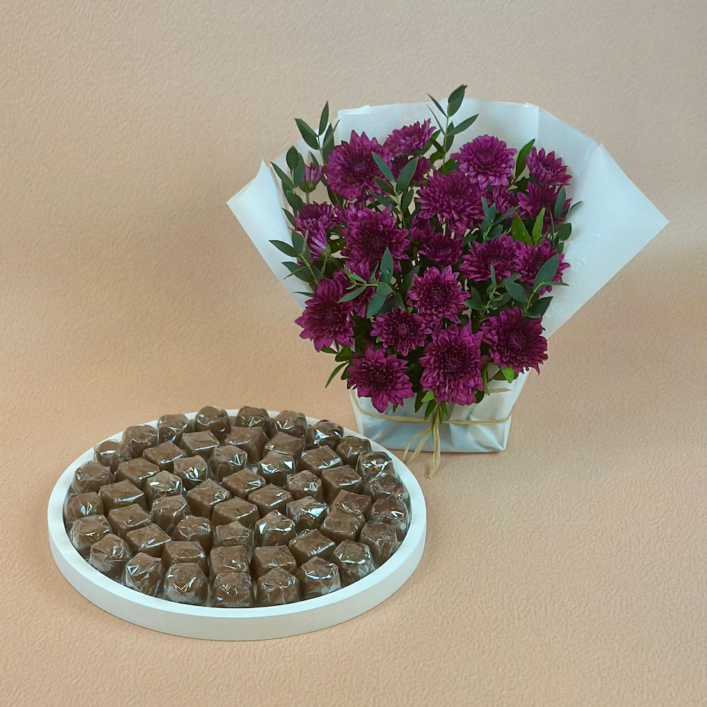 صينية مليئة بالشوكولاتة البلجيكية الفاخرة مع زهور الكريز.