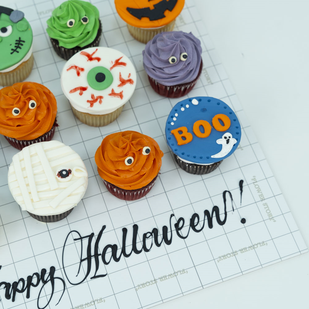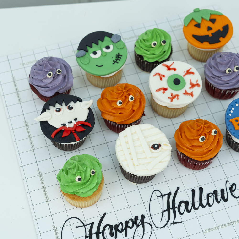 12 قطعة من الكب كيك بنكهات مختلفة، الشوكولاتة والفانيليا والريد فيلفيت.