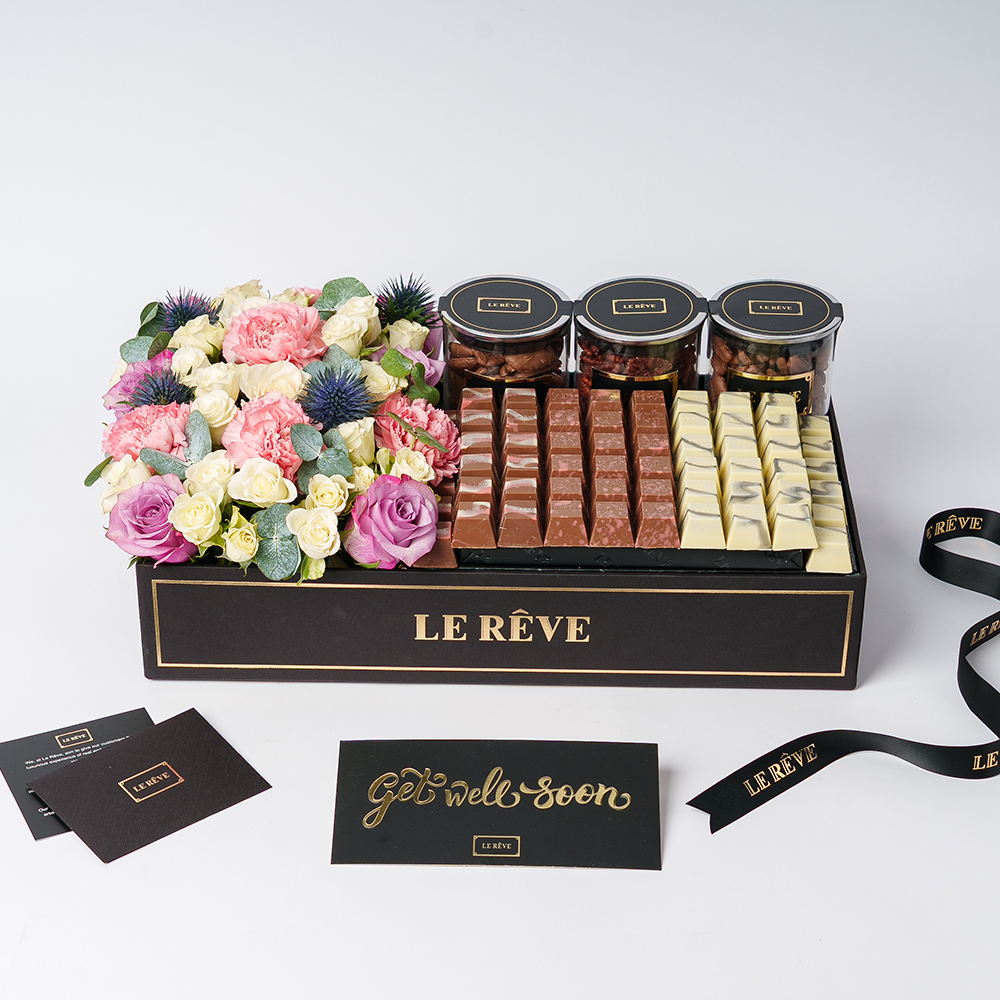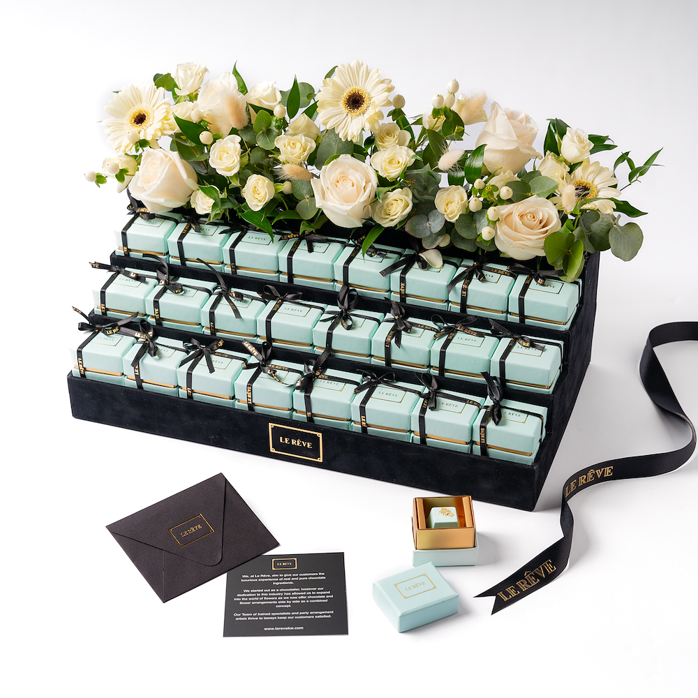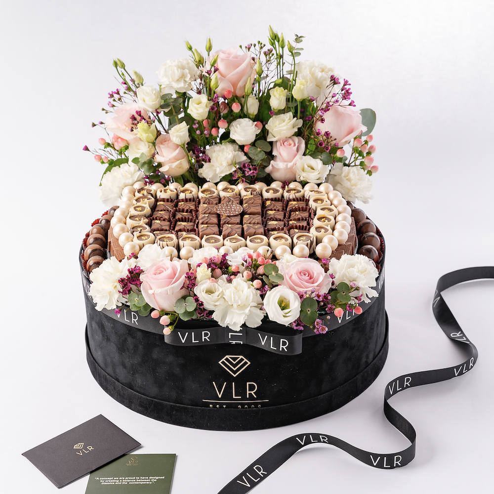 صندوق أبيض يحتوي على 1 كجم من الشوكولاتة مع تنسيقات الزهور الجميلة.