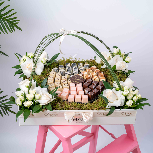 صندوق خشب أسود يحتوي على زهور جميلة و48 قطعة شوكولاتة فاخرة.