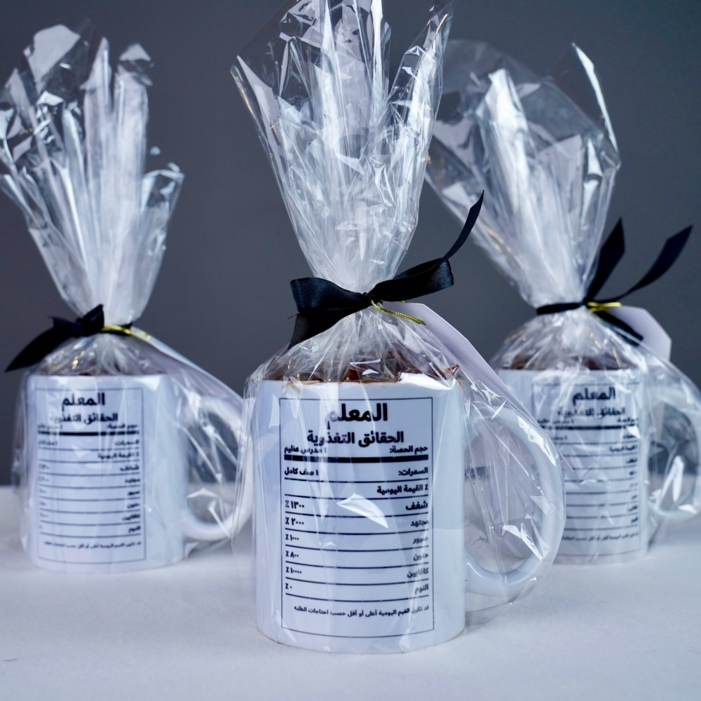 3 أكواب لمعلمي اللغة العربية مطبوعة ومملوءة بكيكة الشوكولاتة وغاناش الشوكولاتة البلجيكية.