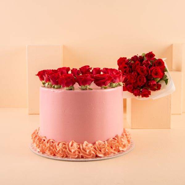 هذه كيكة فانيلا مزينة بالزهور بلون الأحمر وباقة يد بلون الأحمر. يمكنك اختيار نكهة الفانيليا أو الشوكولاتة أو نكهة ريد فيلفيت، يرجى كتابة ملاحظة بالتفاصيل الإضافية.