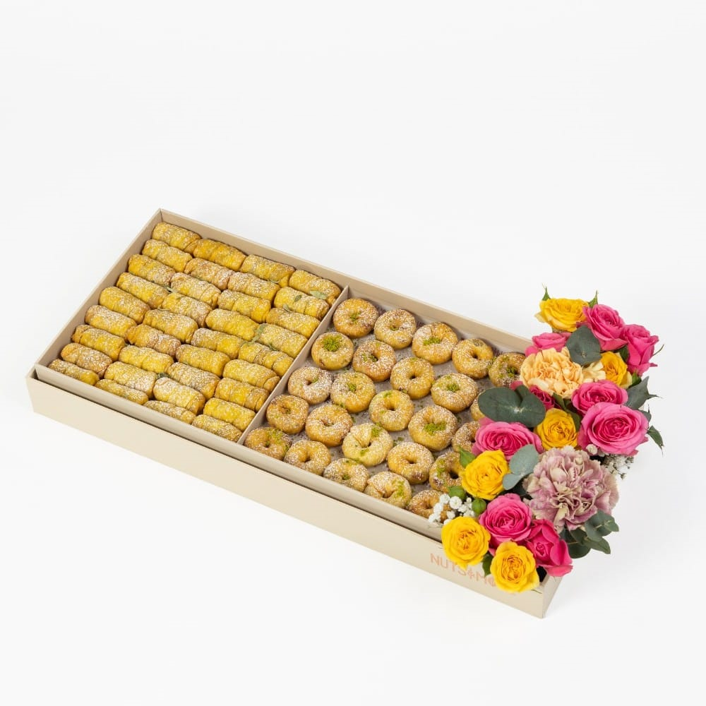 هذه العلبة تحتوي على الدملوج بالفستق والجوز مع الزهور.