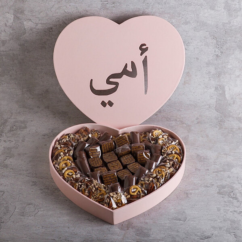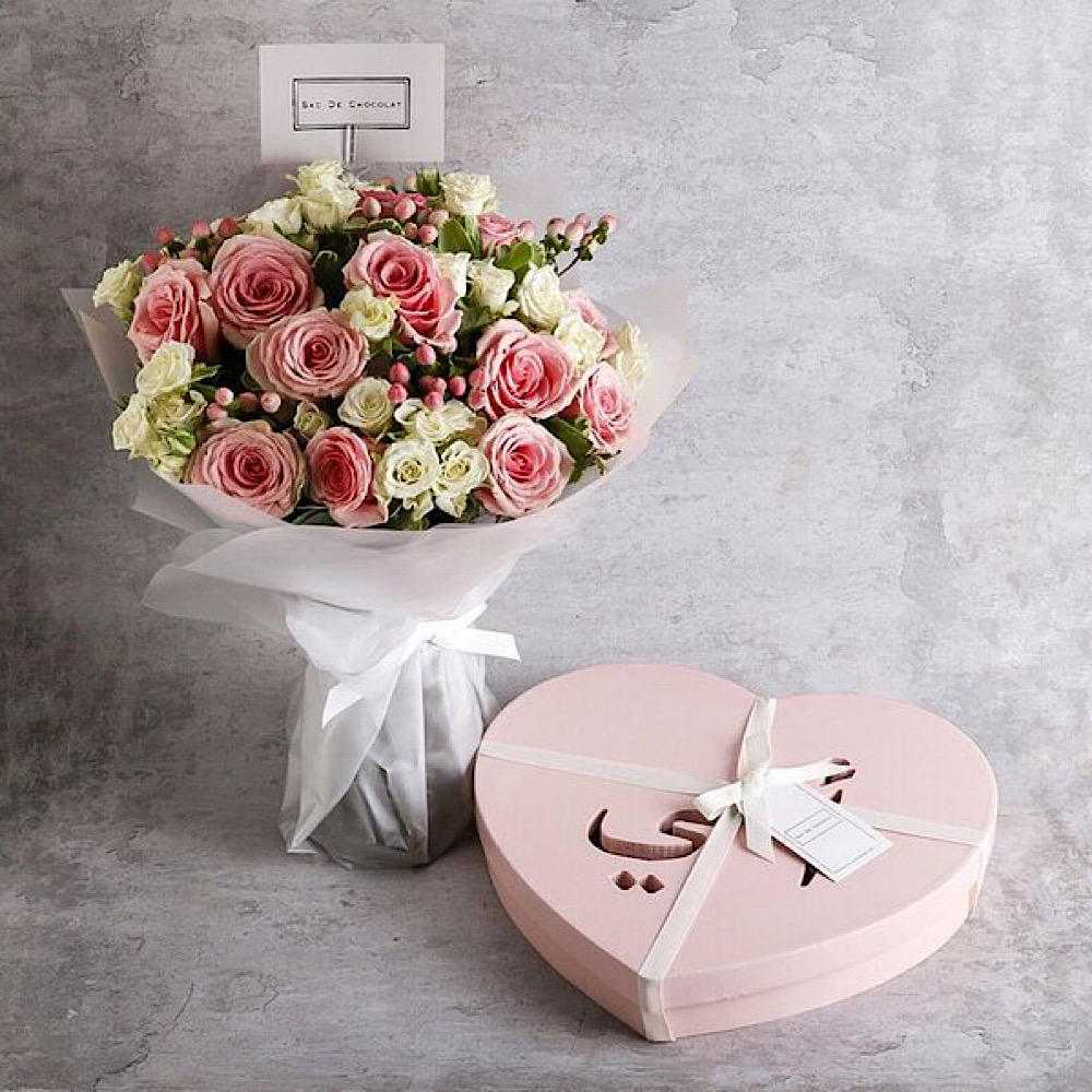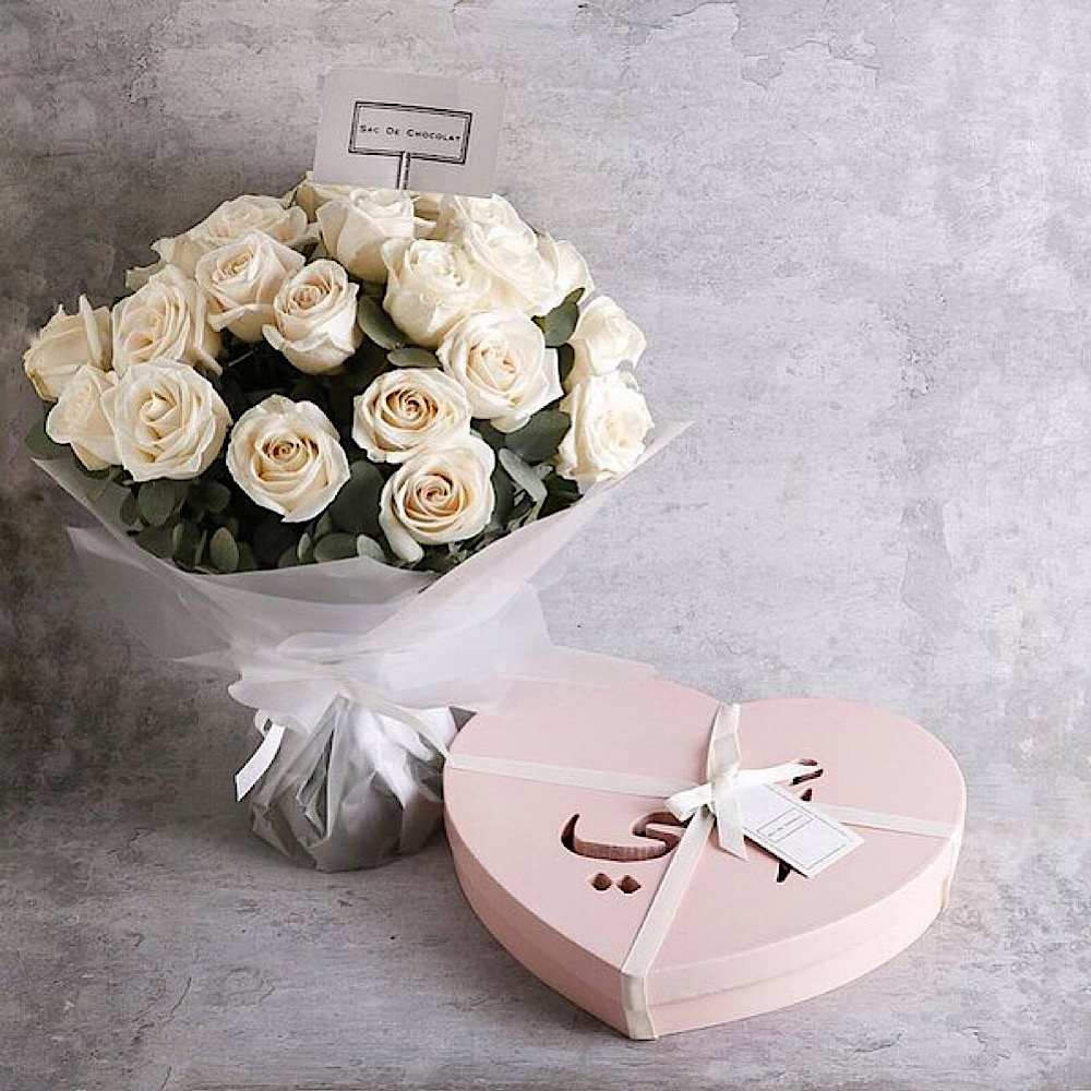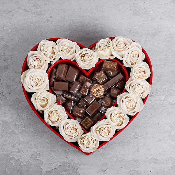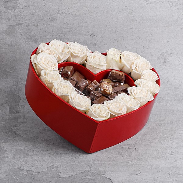 القلب الخشبي مع زهور الجوري البيضاء ويحتوي على 1 كيلو شوكولاتة مشكلة.