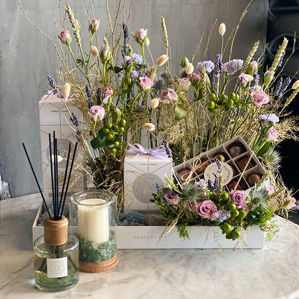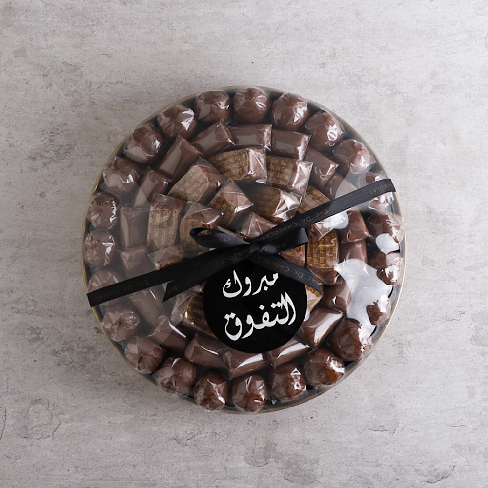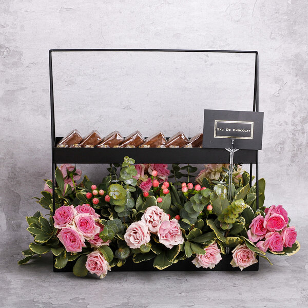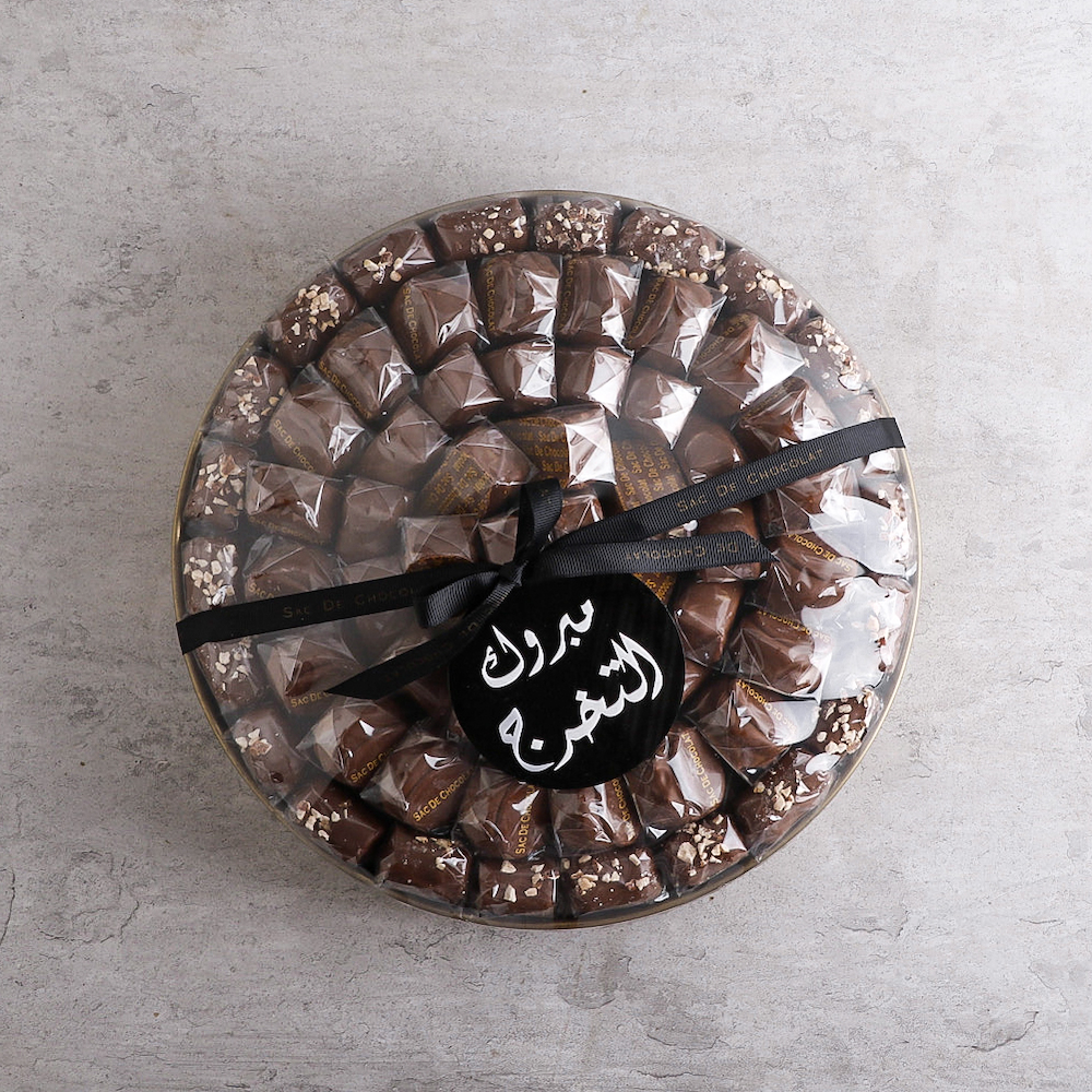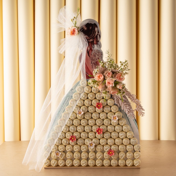 القلب الخشبي مع زهور الجوري البيضاء ويحتوي على 1 كيلو شوكولاتة مشكلة.