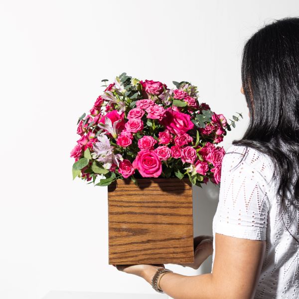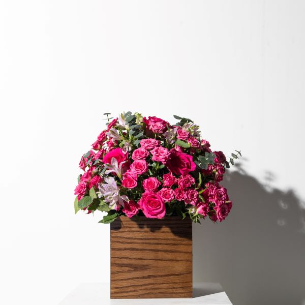 صندوق خشبي يتضمن ببيبي جوري والجوري والستروميريا وورق النباتات الخضراء.