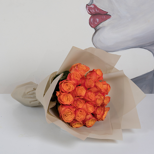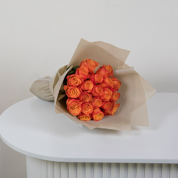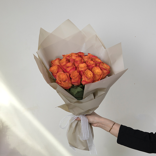 هذه باقة يد من زهور الجوري باللون البرتقالي.