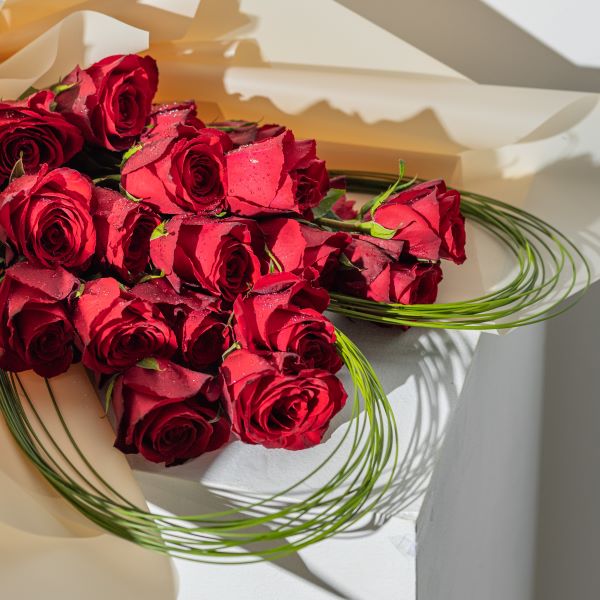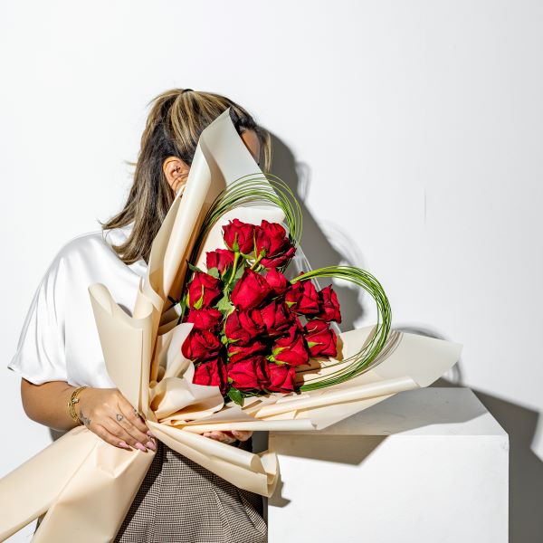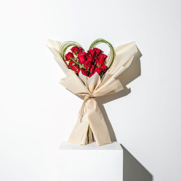 هذه باقة اليد على شكل القلب تحتوي على الجوري الأحمر.