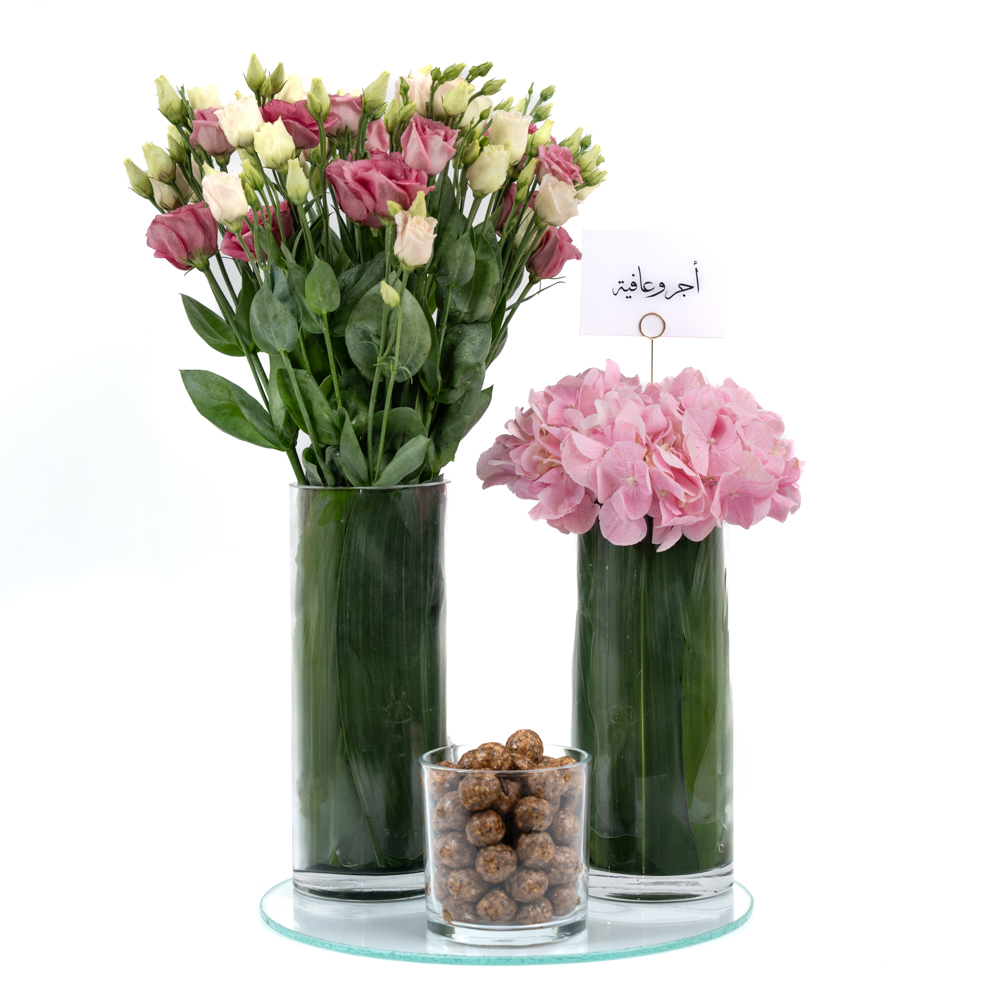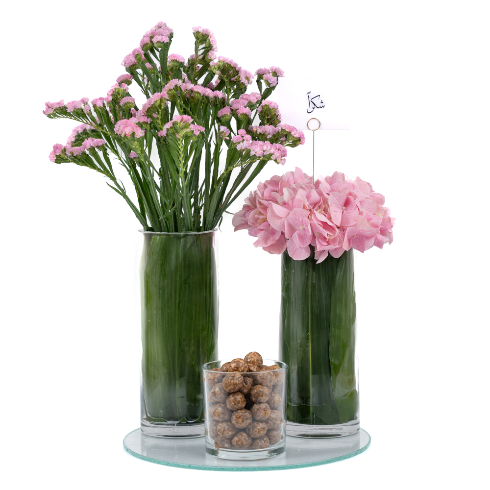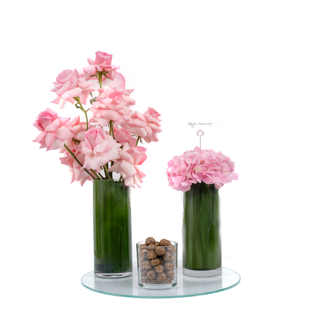صينية من الزجاج تحتوي على فازة من الجوري وفازة من الهايدرينجيا وفازة من حلويات الشوكولاتة الداكنة. ملاحظة: يمكنكم الكتابة على صينية الزجاج.