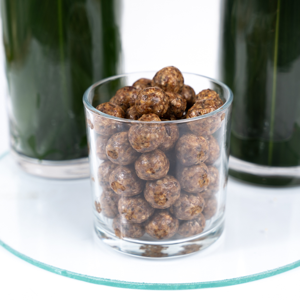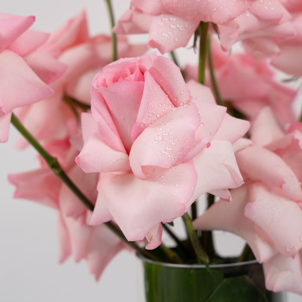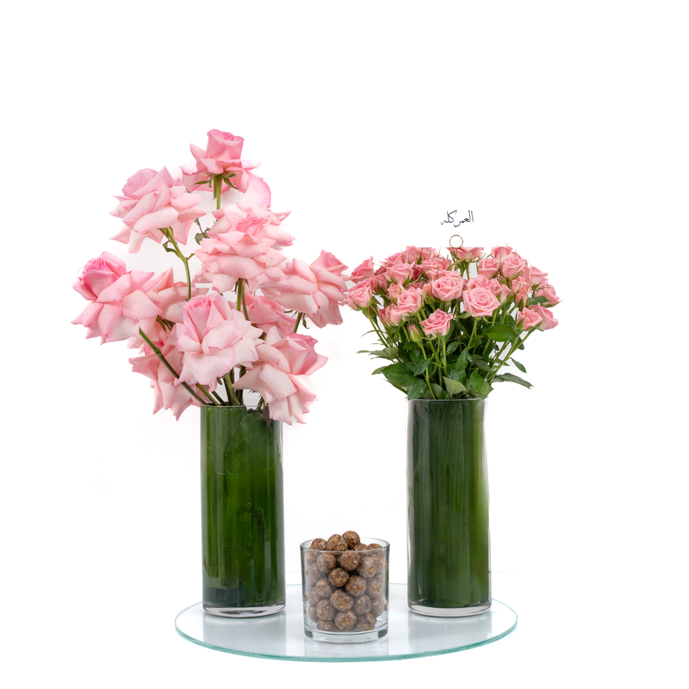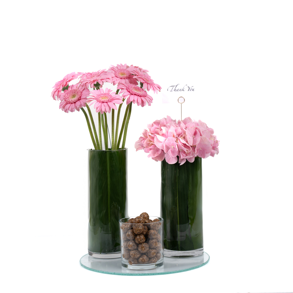 صينية من الزجاج تحتوي على فازة من الجوري وفازة من الهايدرينجيا وفازة من حلويات الشوكولاتة الداكنة. ملاحظة: يمكنكم الكتابة على صينية الزجاج.