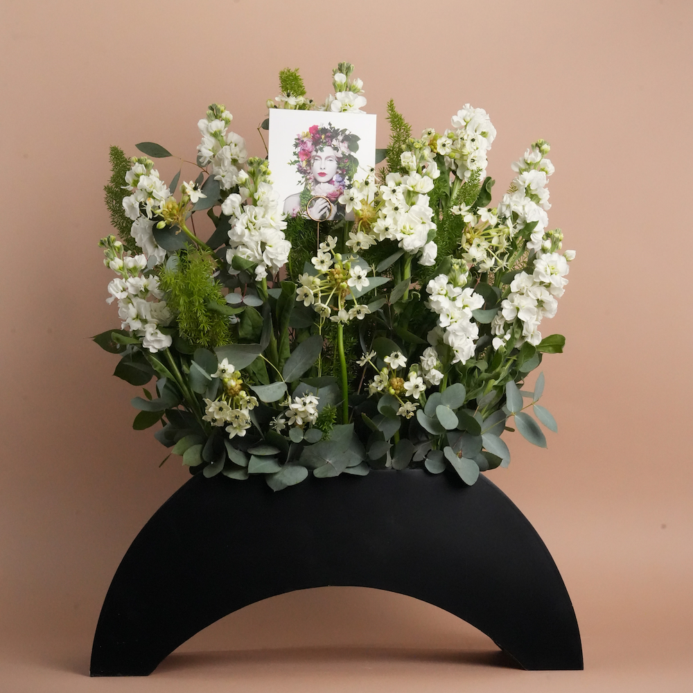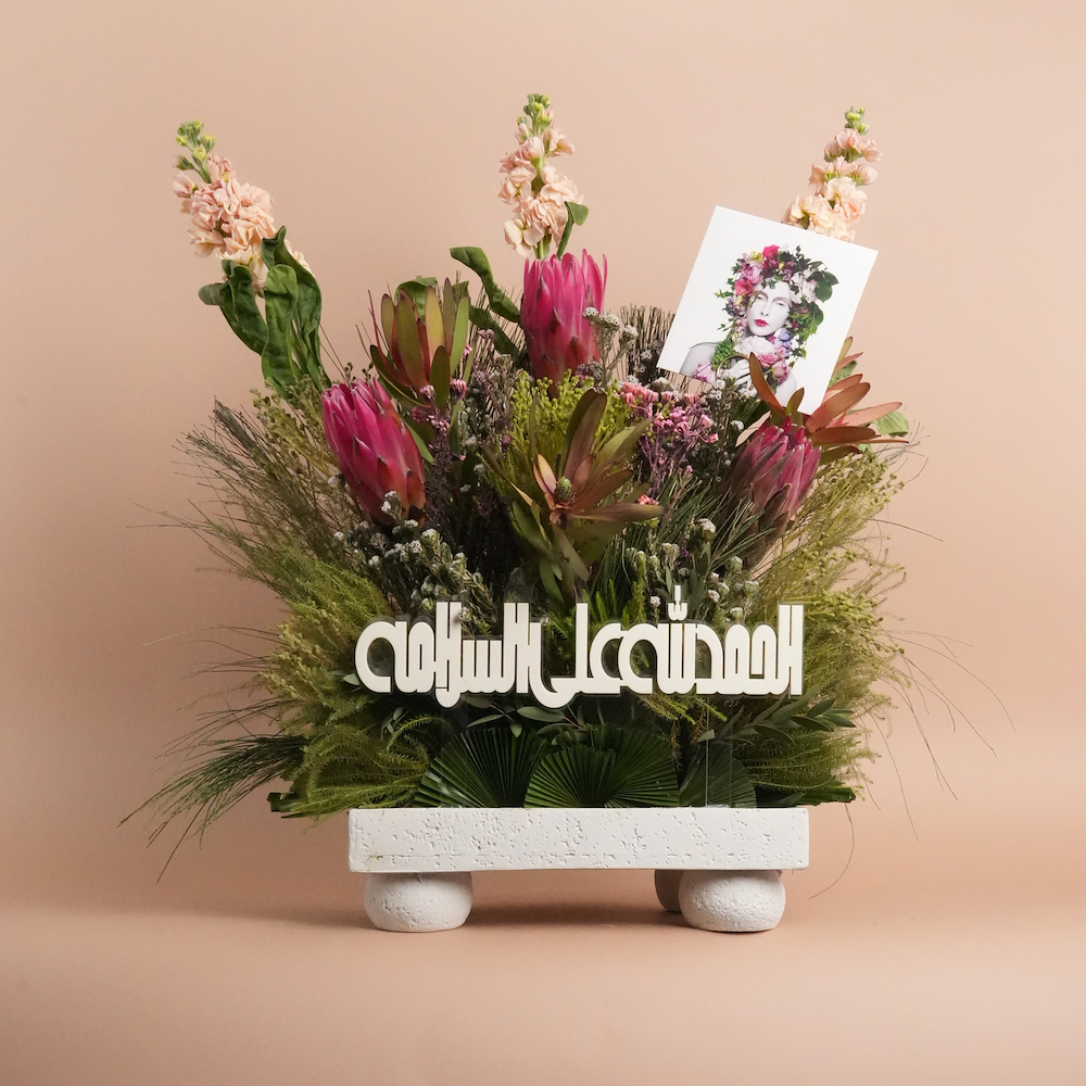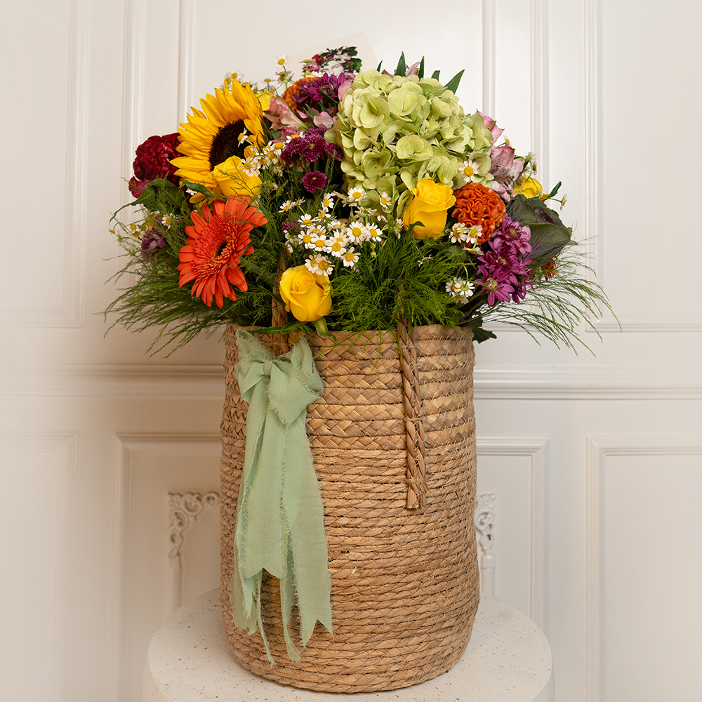 سلة منسوجة بروح ريفية تزدان بفرحة الألوان، تحتوي على زهور دوار الشمس، الجيربيرا، الجوري، الهايدرينجا والكريز، يجتمعون في تناغم نابض بالحياة، مزينة بشريط أخضر ناعم يضفي لمسة من السحر الطبيعي.