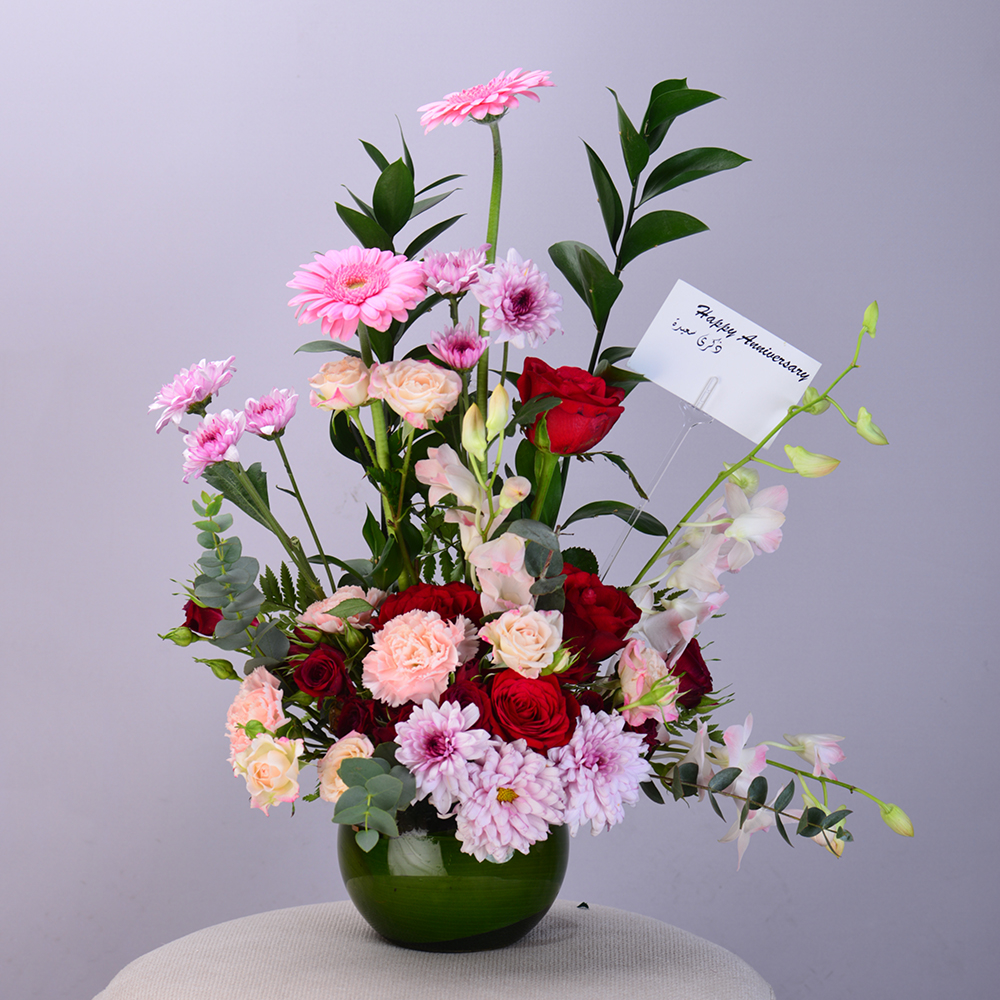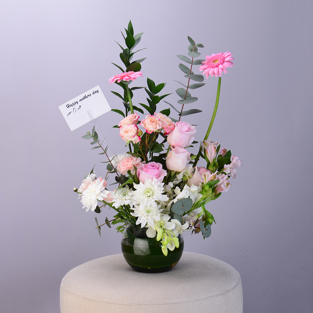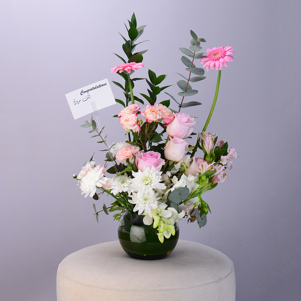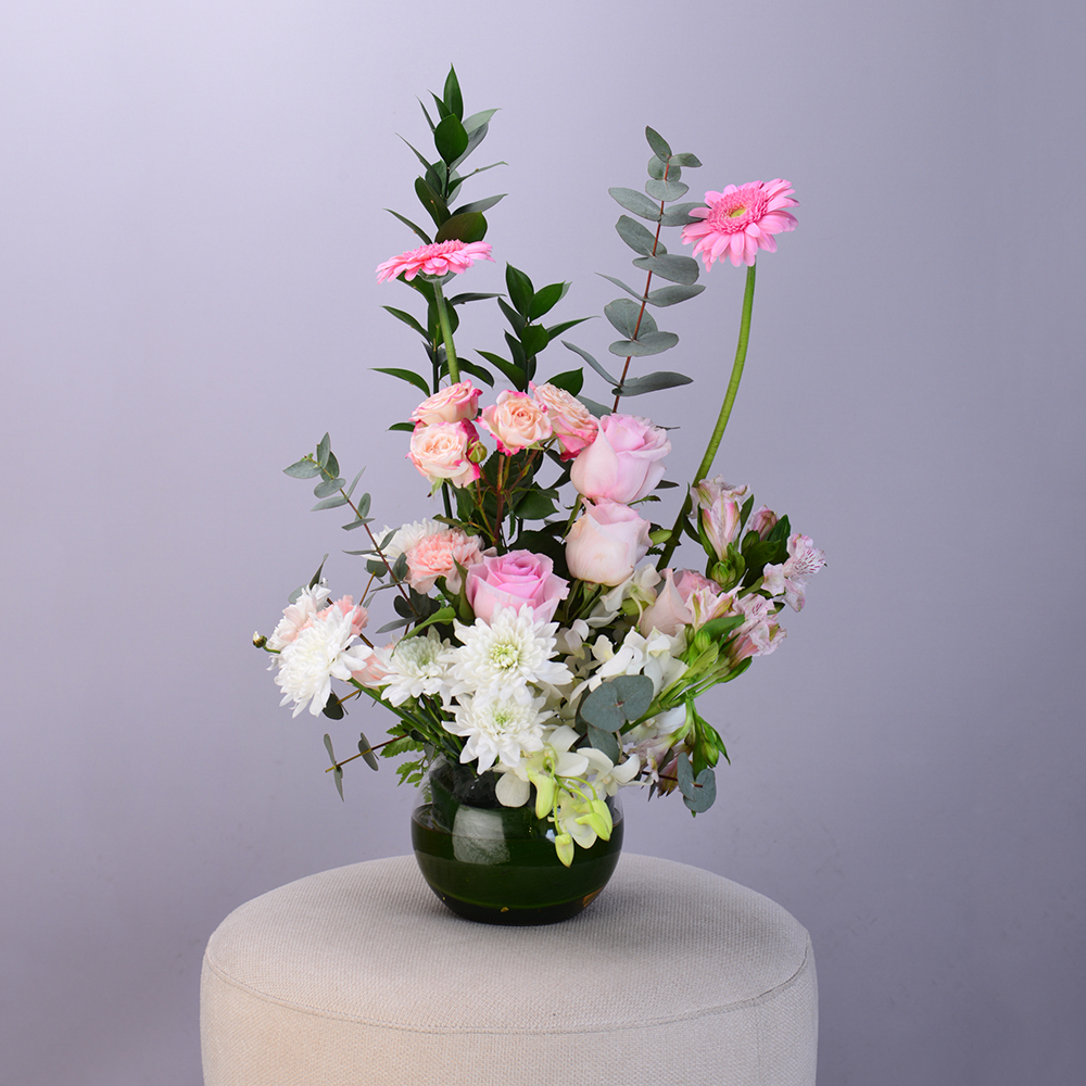 فازة مبهجة من زهور الجوري، البيبي جوري، الكريز، الجيربيرا، الألستروميريا والبيبي أوركيد، تشع بالدفء والسعادة.