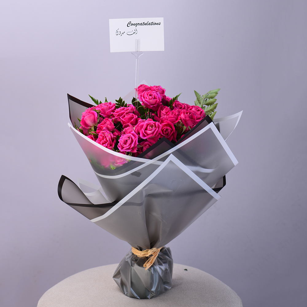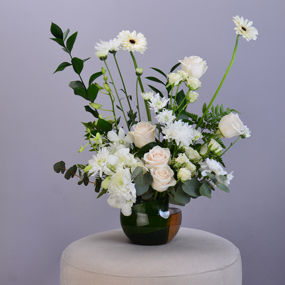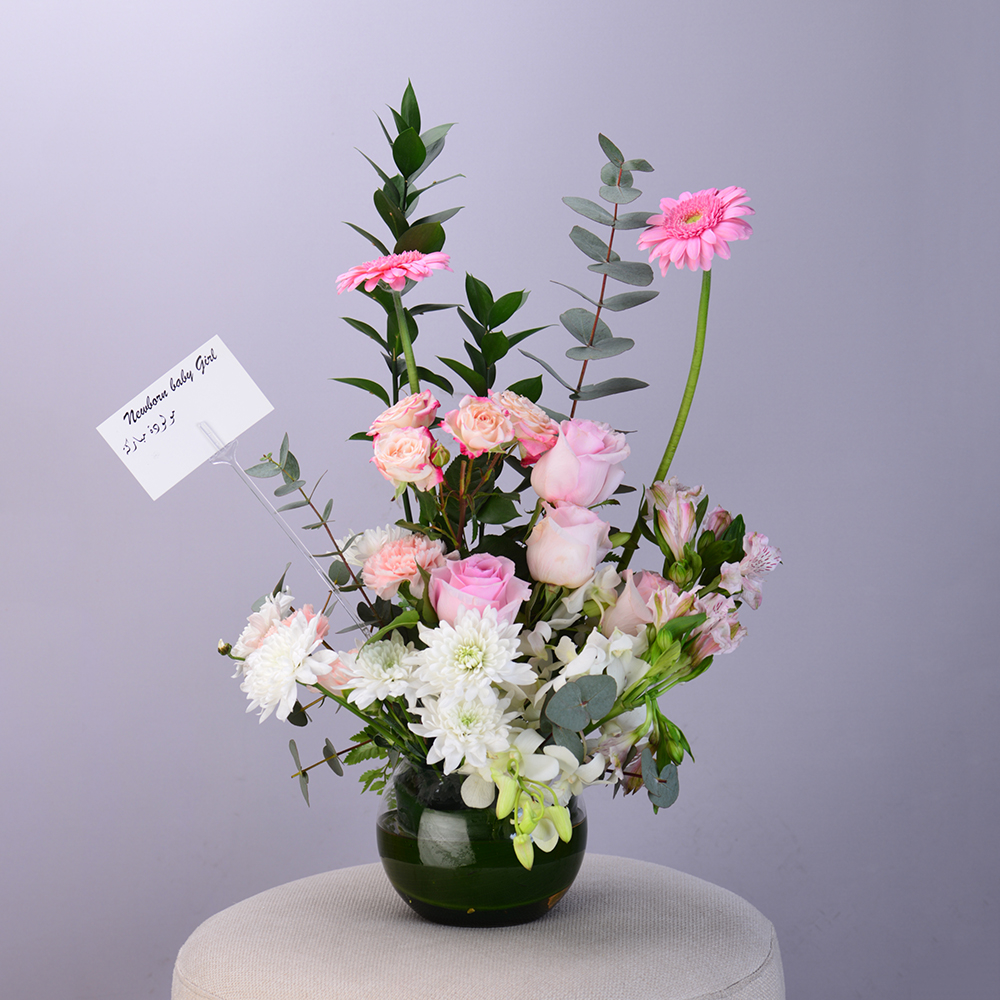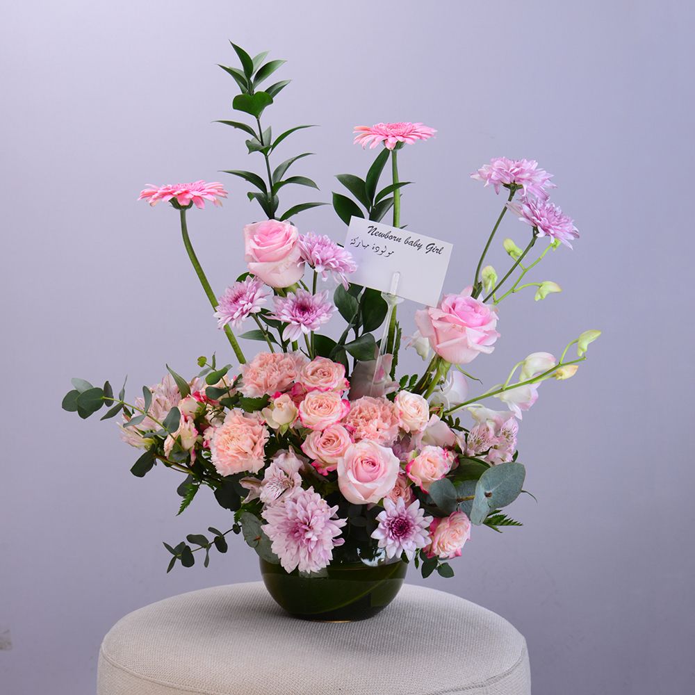 فازة مبهجة من زهور الجوري، البيبي جوري، الكريز، الجيربيرا، الألستروميريا والبيبي أوركيد، تشع بالدفء والسعادة.