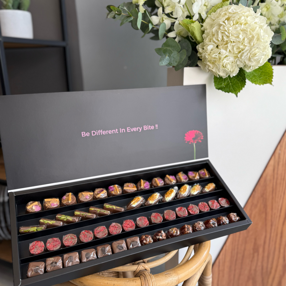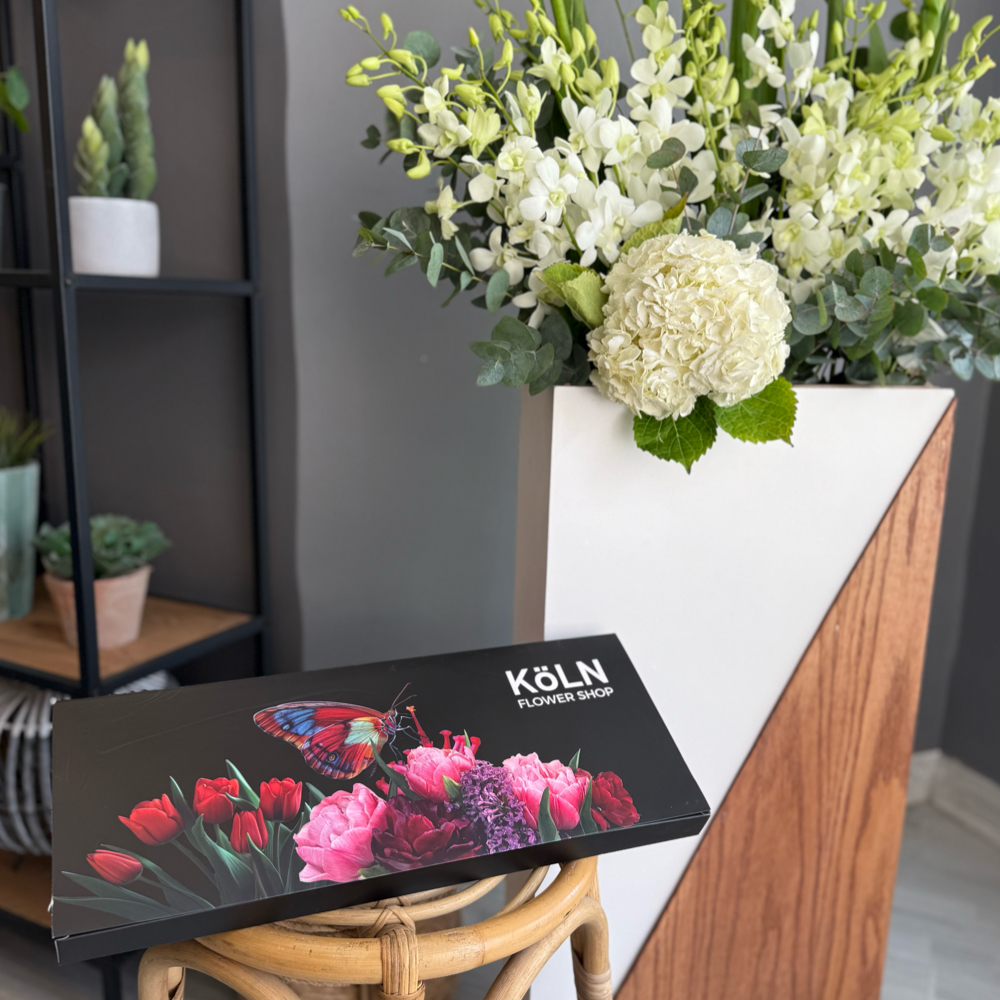 هذه الباقة تحتوي على زهور الأوركيد، الهايدرينجا، أوراق الأوكالبتوس والجلاديولس، مرتبة بشكل جميل في ستاند مع علبة من حلوى القهوة.