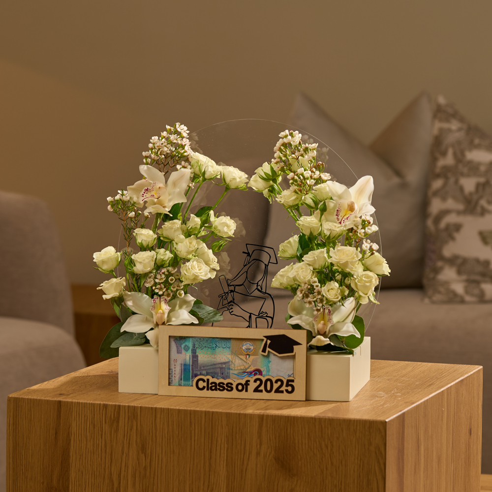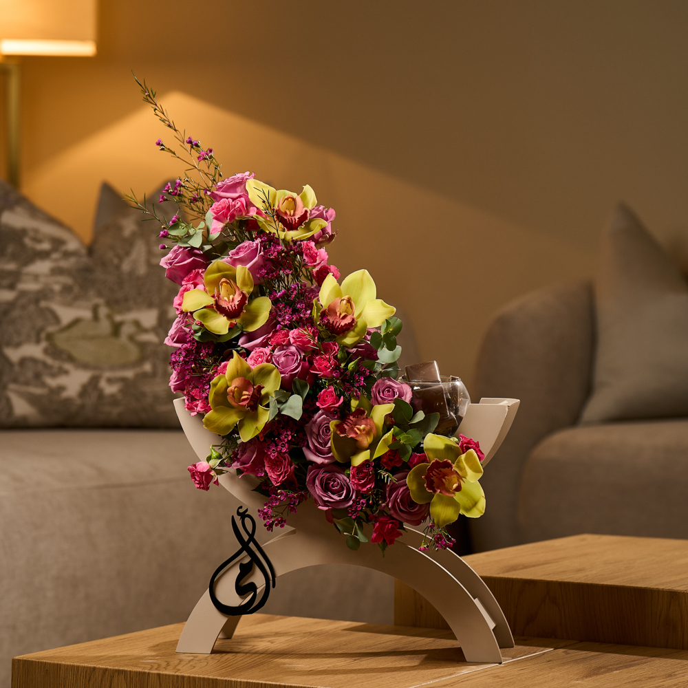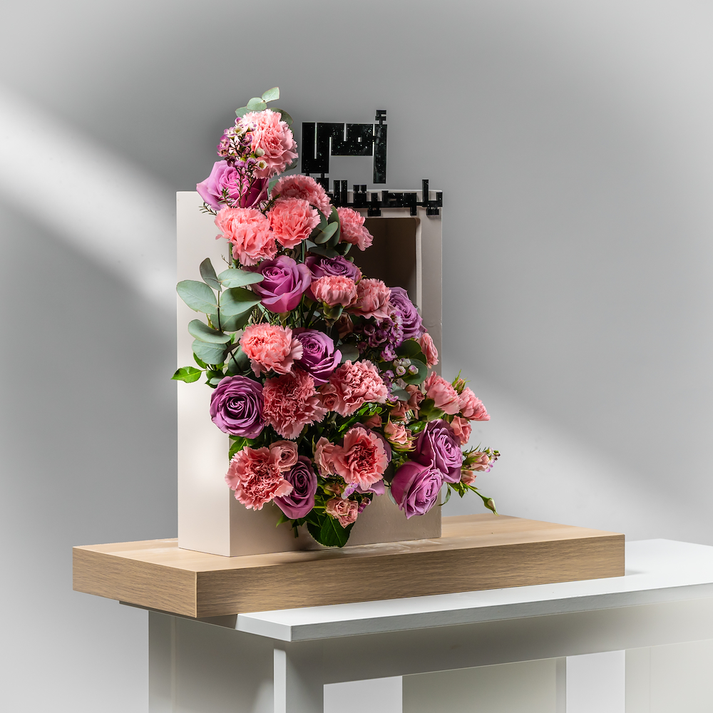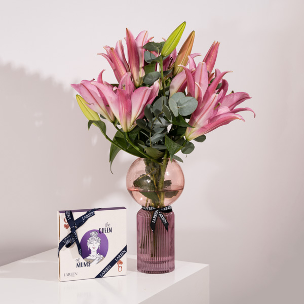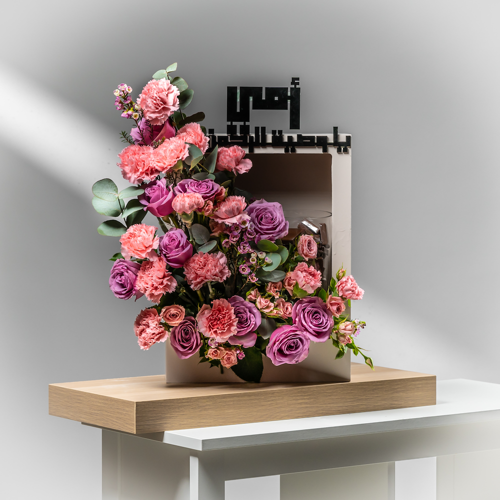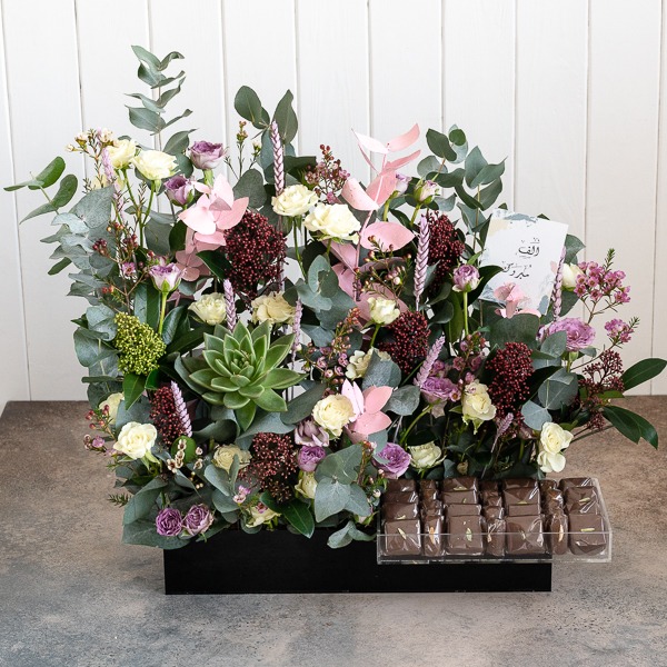 هذه الباقة تحتوي على الكارنيشن، الجوري والبيبي جوري مع الشوكولاتة.