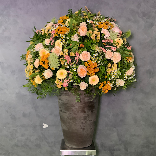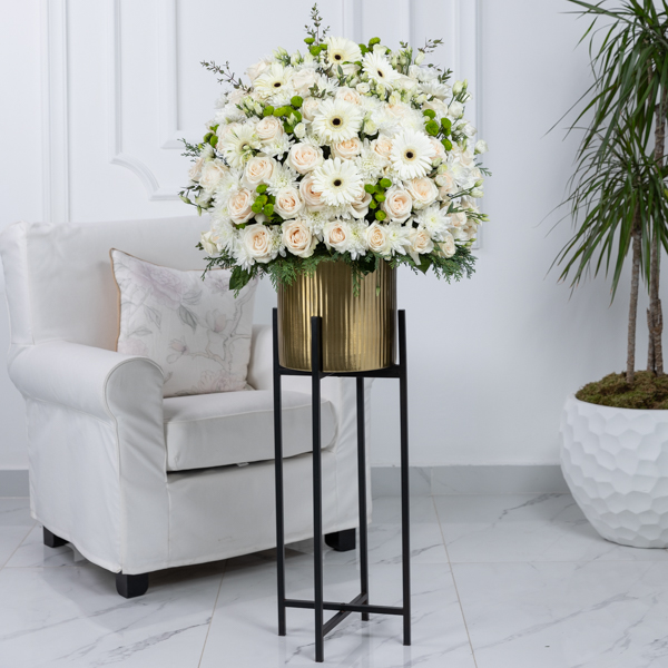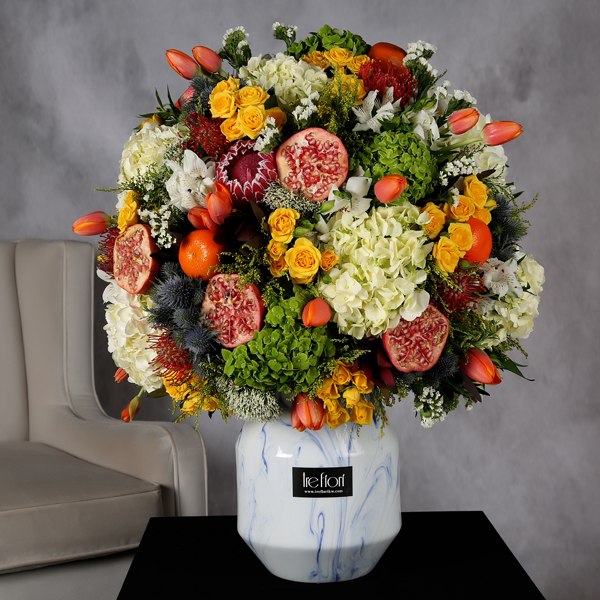 باقة تحتوي على الجوري بتغليف بنفسجي.