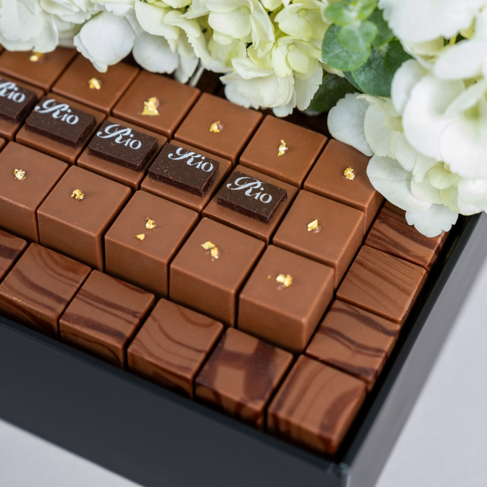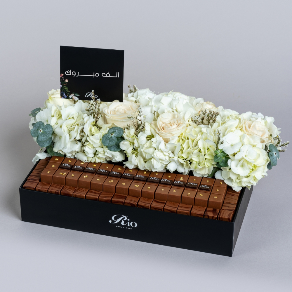 صينية أنيقة تضم زهور الجوري، الهايدرينجا والليمونيوم مع شوكولاتة فرنسية. الهدية المثالية للشفاء أو للإحتفال.
