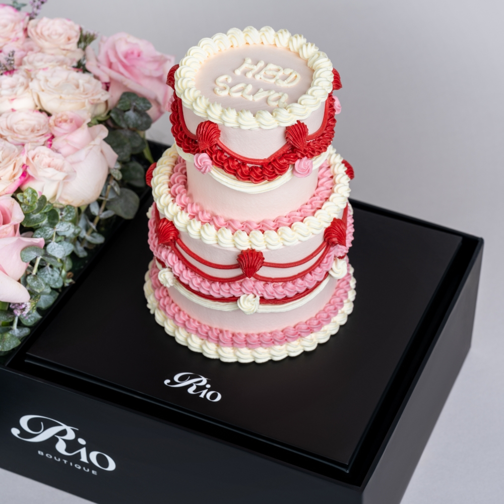 صندوق يضم 12 من الجوري والبيبي جوري مع كيكة. هدية أنيقة وحلوة لأعياد الميلاد أو لأي احتفال مبهج.
