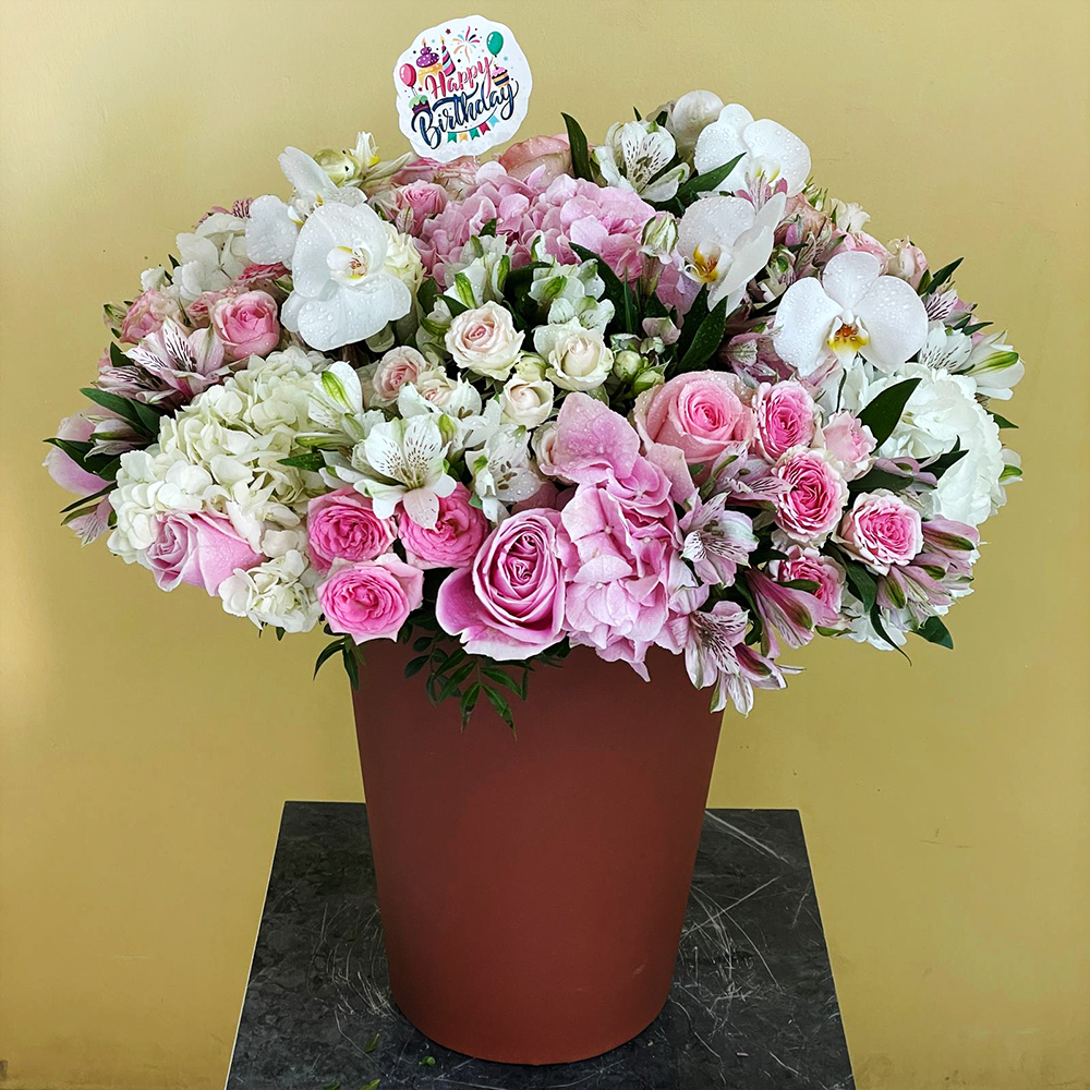 بلانتر يحتوي على زهور أوركيد بيضاء وإشفيريا.