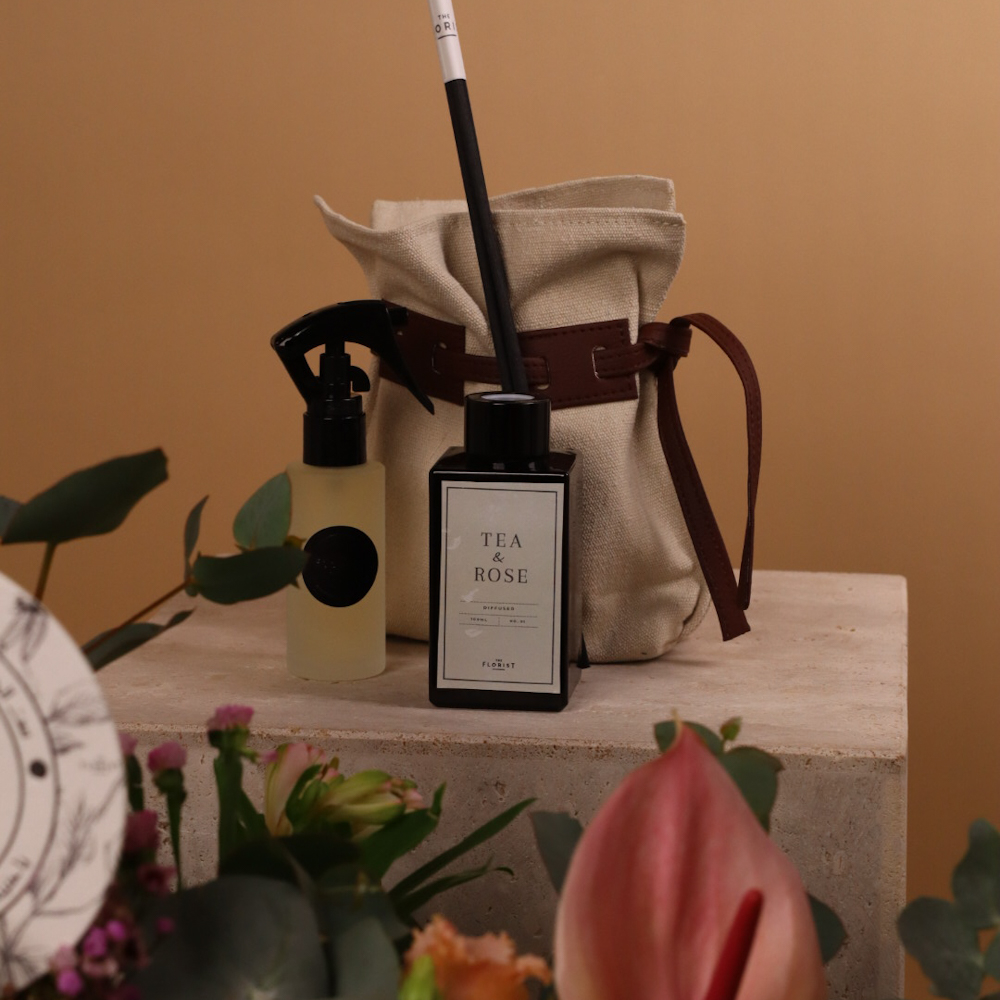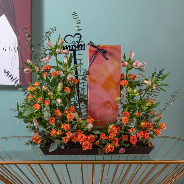 صندوق يحتوي على زهور البيبي جوري والرانونكولوس مع الأوكالبتوس وزهور الواكس مع فواحة.