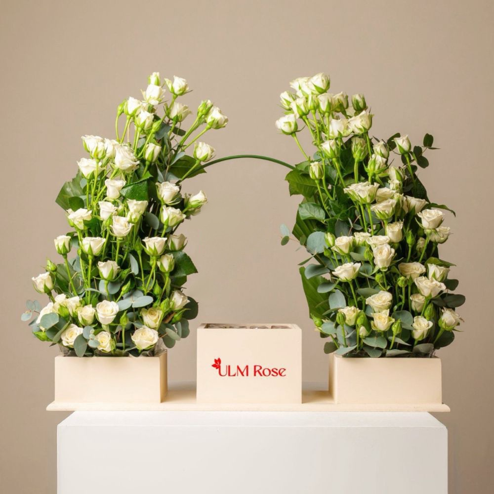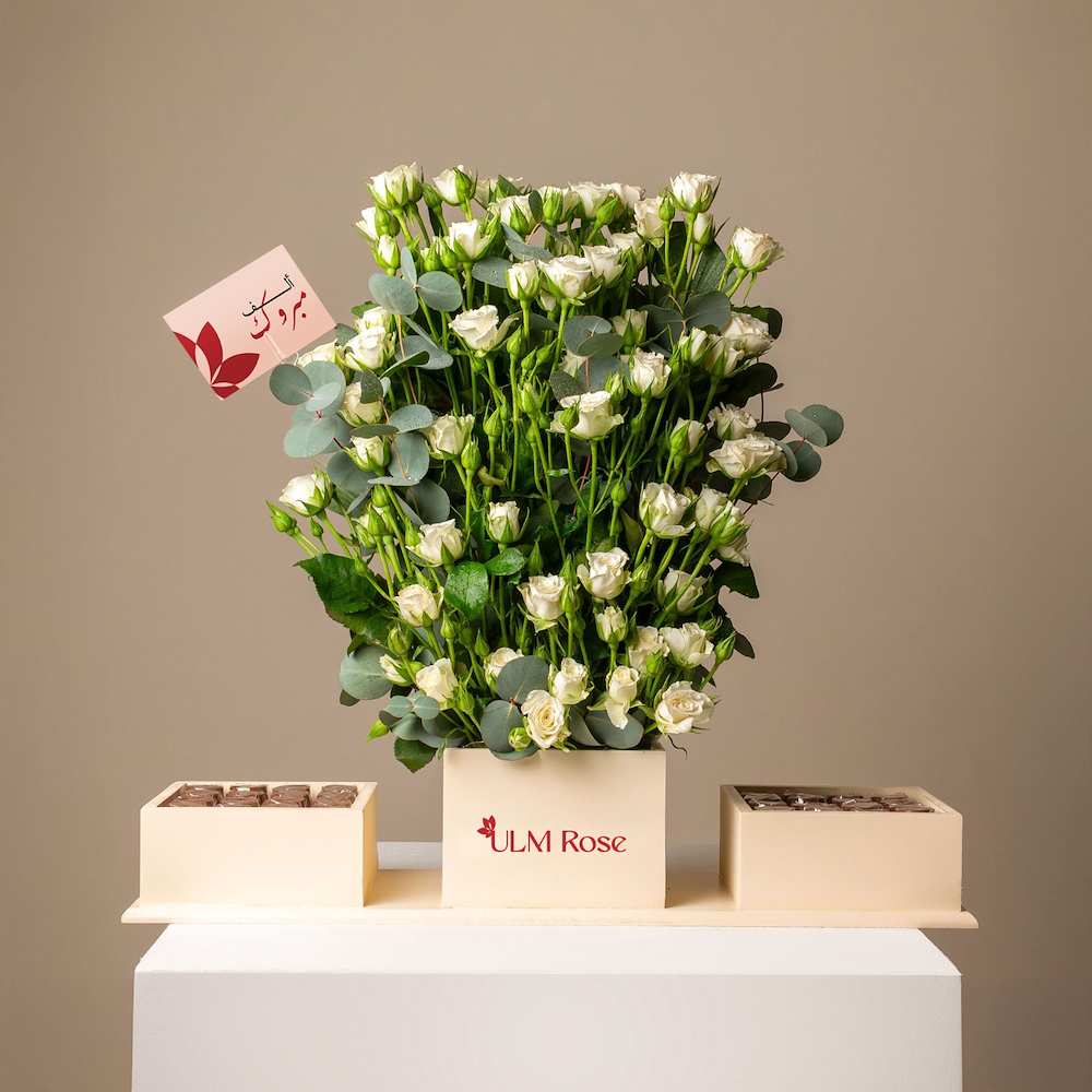 هذه الباقه المميزه تحتوي على ازهار الجوري والبيبي جوري وزهره الكوبيه وخضار الكوليبتس.