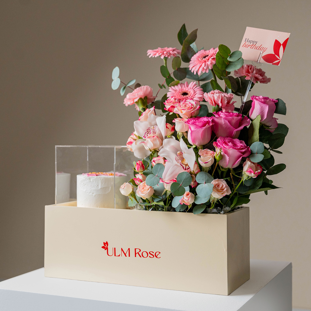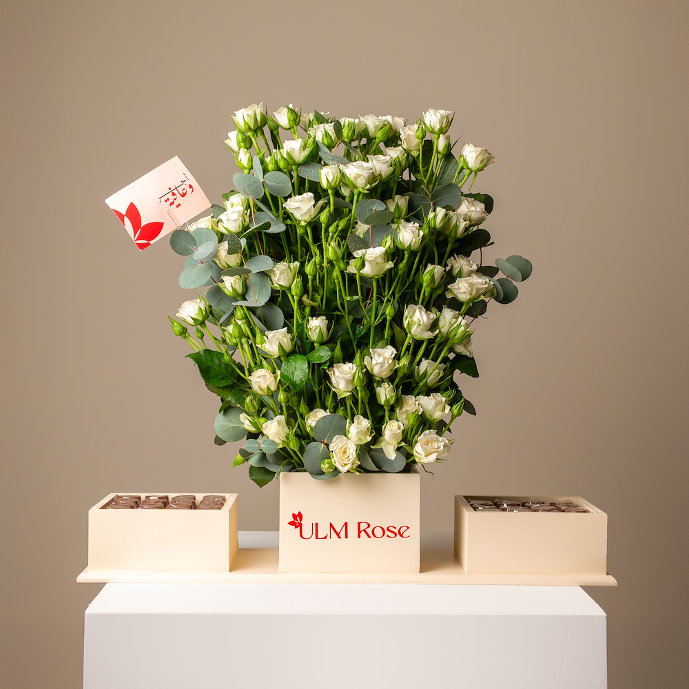 باقة تحتوي على الجوري، البيبي جوري، الجيربيرا، زهور الواكس واليوكالبتوس مع الشوكولاتة البلجيكية.