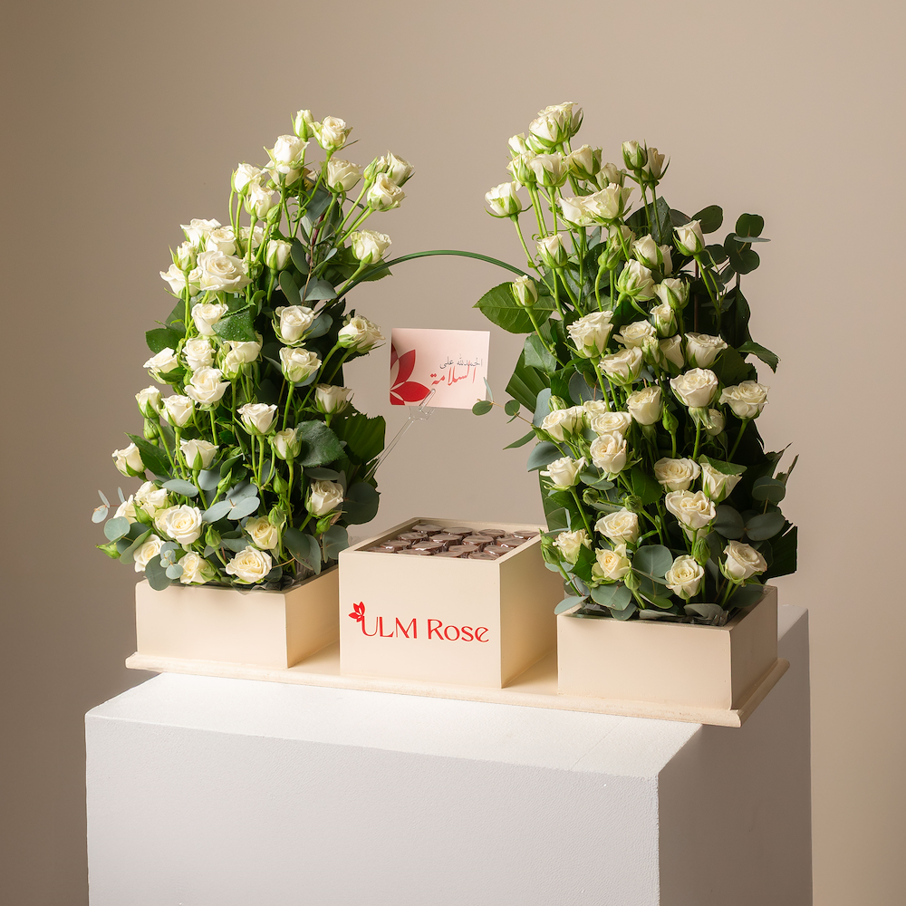 هذه الباقة تحتوي على زهور البيبي جوري والكارنيشن البيضاء مع الشوكولاتة.