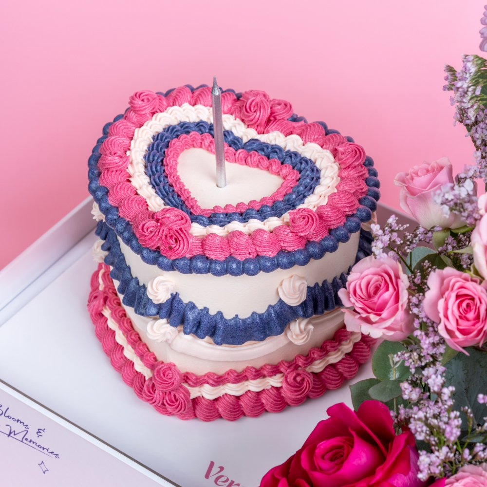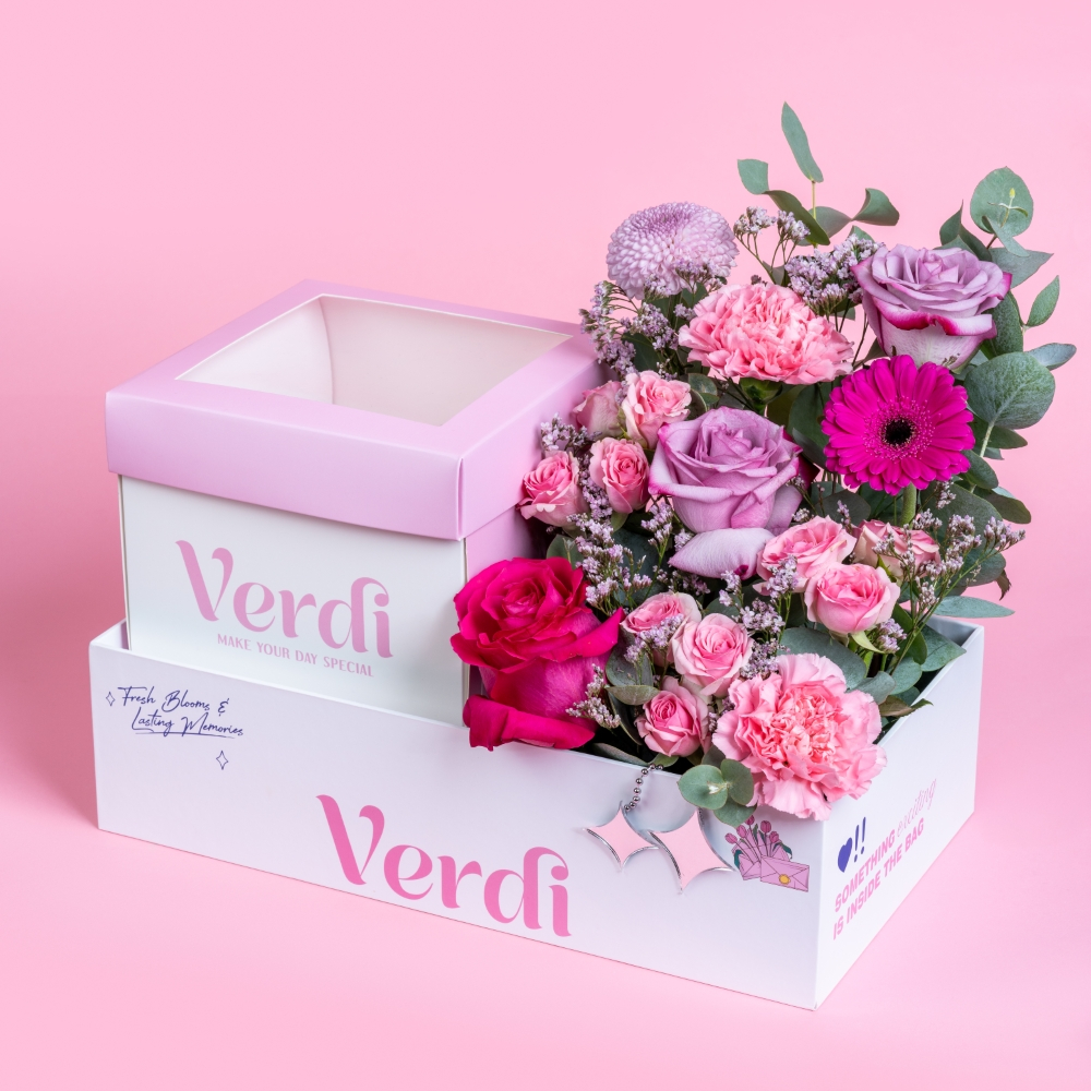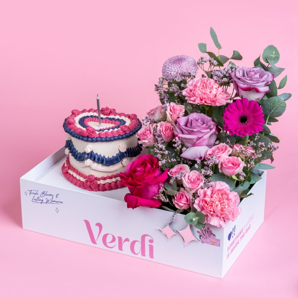 بوكس يحتوي على أزهار الكريز، الجوري، التوليب، الجيربيرا والأوكالبتوس مع كيكة.