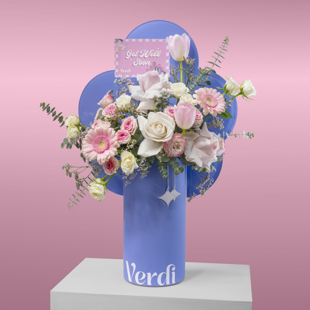 فازة رقيقة تضم زهور التوليب، البيبي جوري، الجيربيرا والجوري، بتنسيق ساحر يضيف لمسة من الأناقة والرقة.
