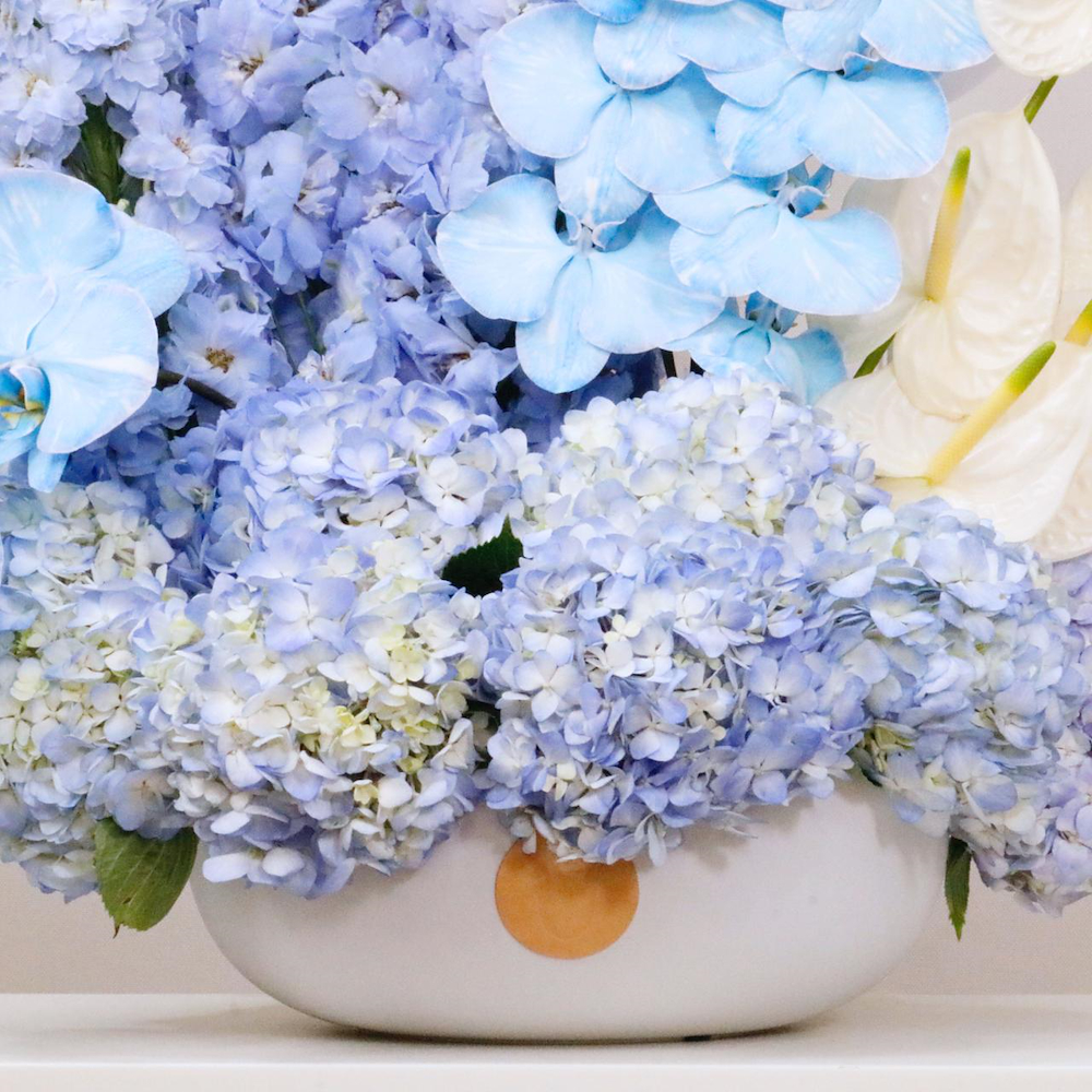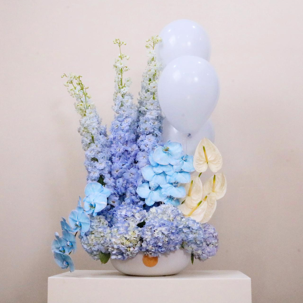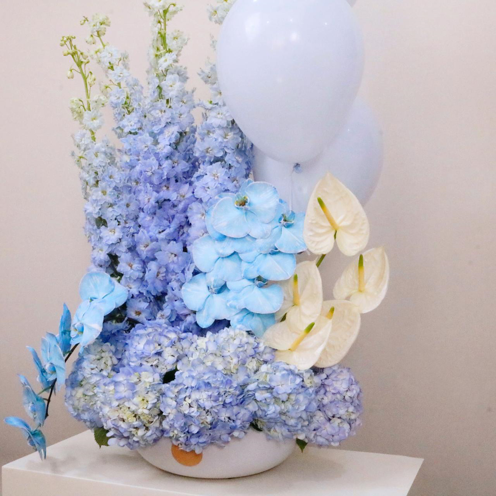 فازة مليئة بأزهار الهايدرنجا، الدلفينيوم، الأنثوريوم والأوركيد مع البالونات.