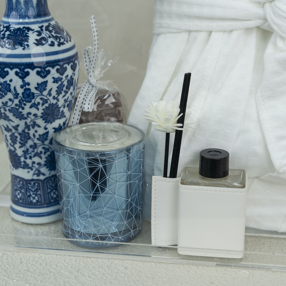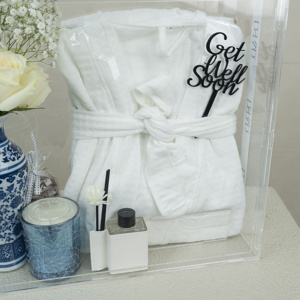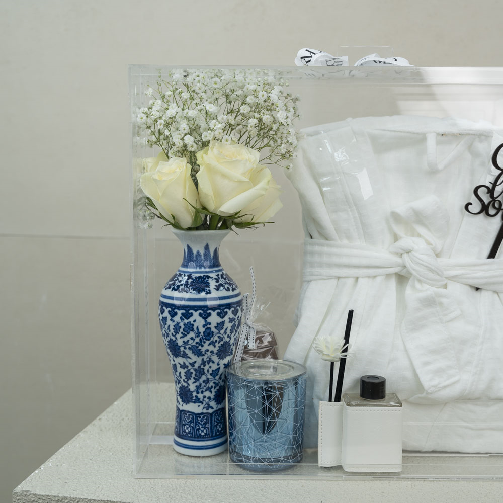 حامل أنيق من الأكريلك يحتوي على فازة مزينة بزهور الجوري والجبسوفيلا، رداء منزلي، شمعة بعطر أنيق، فواحة زيت عطرية و8 قطع من الشوكولاتة البلجيكية بالويفر.