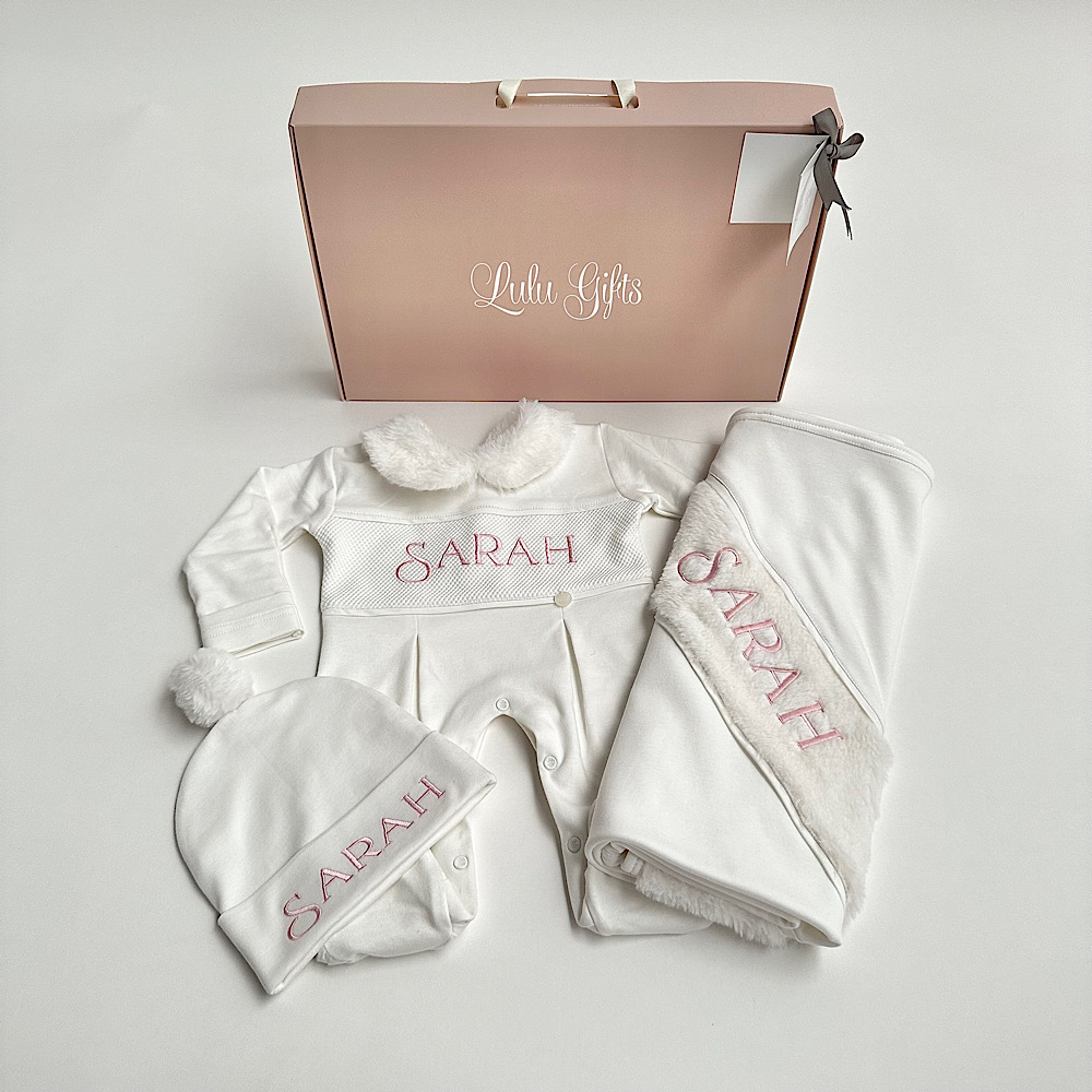 مجموعة أفرول مريحة للأطفال مصنوعة من القطن الناعم والفرو، مع قبعة متناسقة وغطاء قماشي ناعم لمزيد من الدفء والراحة. متوفرة بمقاسات للمواليد الجدد، من شهر إلى 3 أشهر، ومن 3 إلى 6 أشهر.