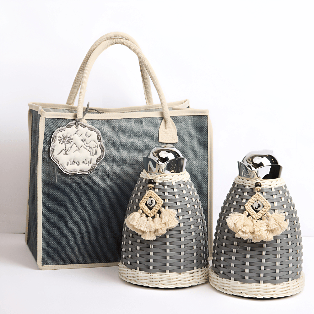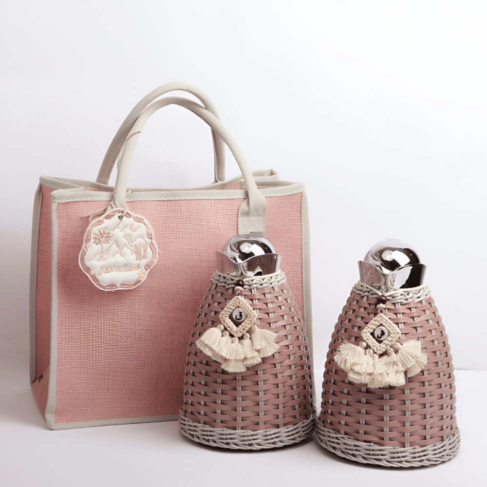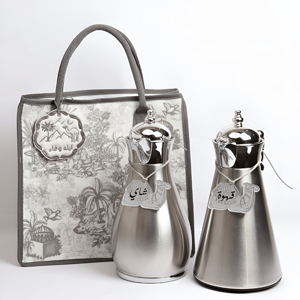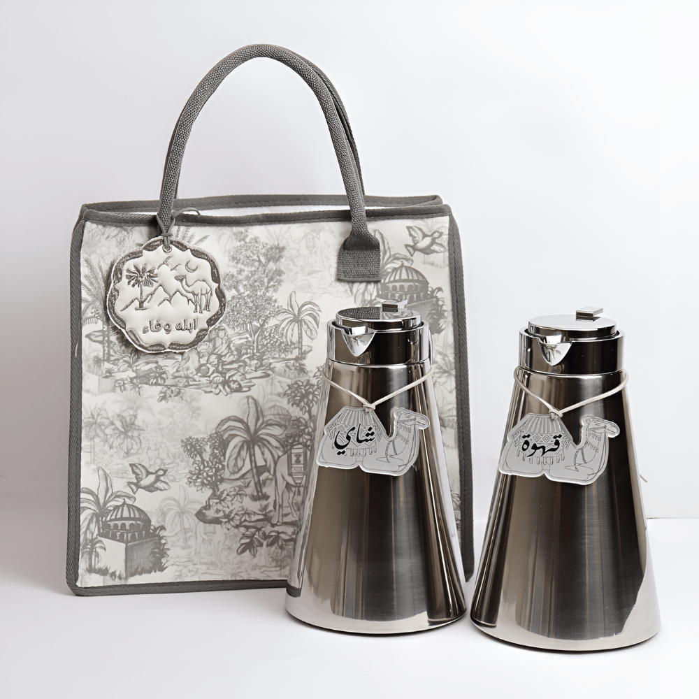 مجموعة من مطارتين ستانلس ستيل كل مطارة 1 لتر مع حقيبة الجزيرة وتاق الشاي والقهوة بتصميم الجمل.