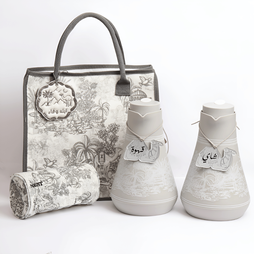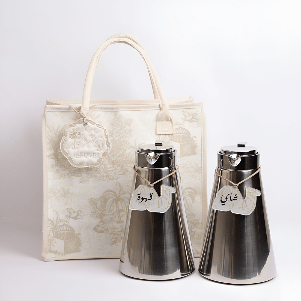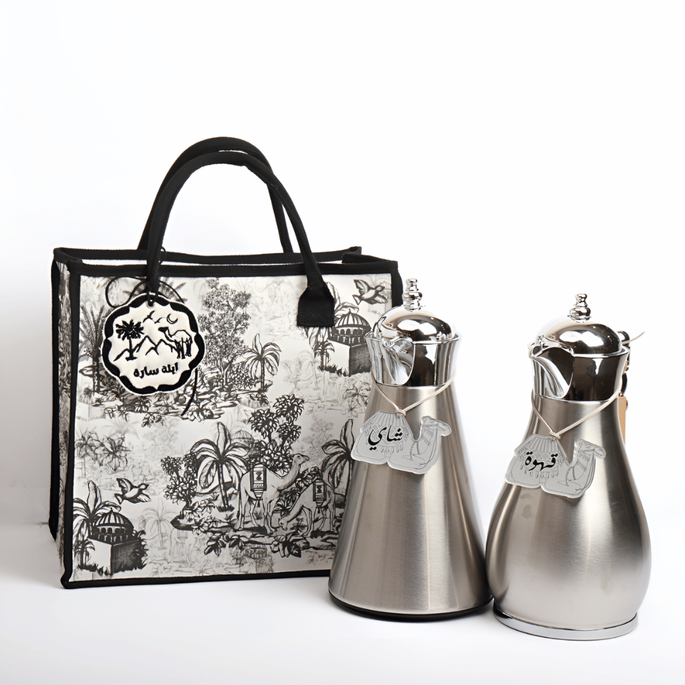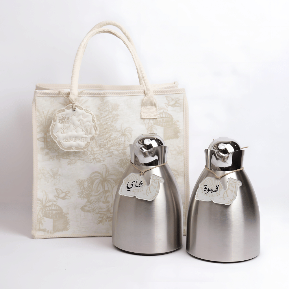 مجموعة من مطارتين الجزيرة مع علاقات الجمل باللون الرمادي. سعة المطارة الواحدة 1 لتر. لون المطارتين: الرمادي. مجموعة مطارتين ستيل، الجدار مبطن بزجاج مزدوج يحفظ الحرارة لمدة 8 ساعات. حقيبة الجزيرة باللون الرمادي بقياس 36*20*33 سانتي. حقيبة كانفاس بتصميم الجزيرة باللون الرمادي بقياس 18*10*9 سانتي. علاقات من الاكريليك بتصميم الجمل للقهوة والشاي.