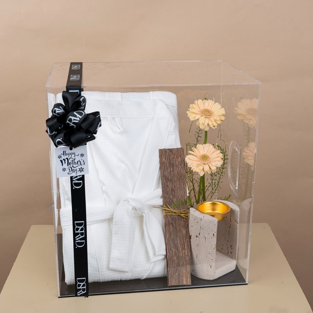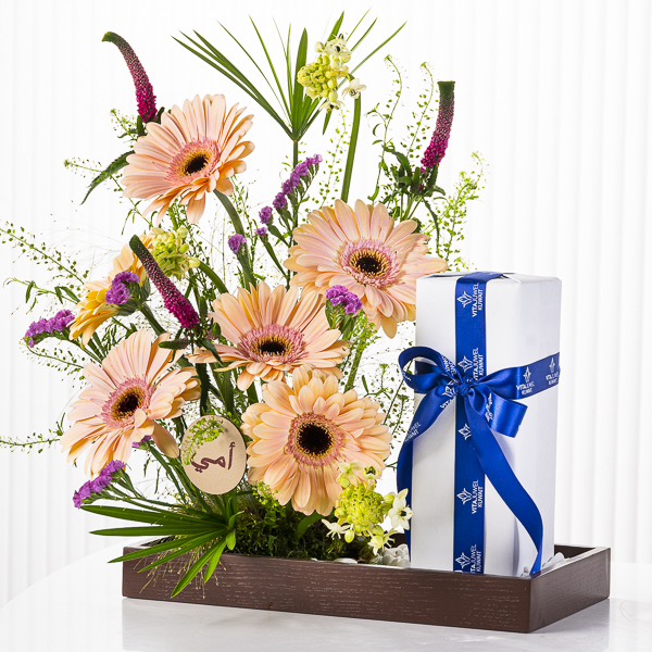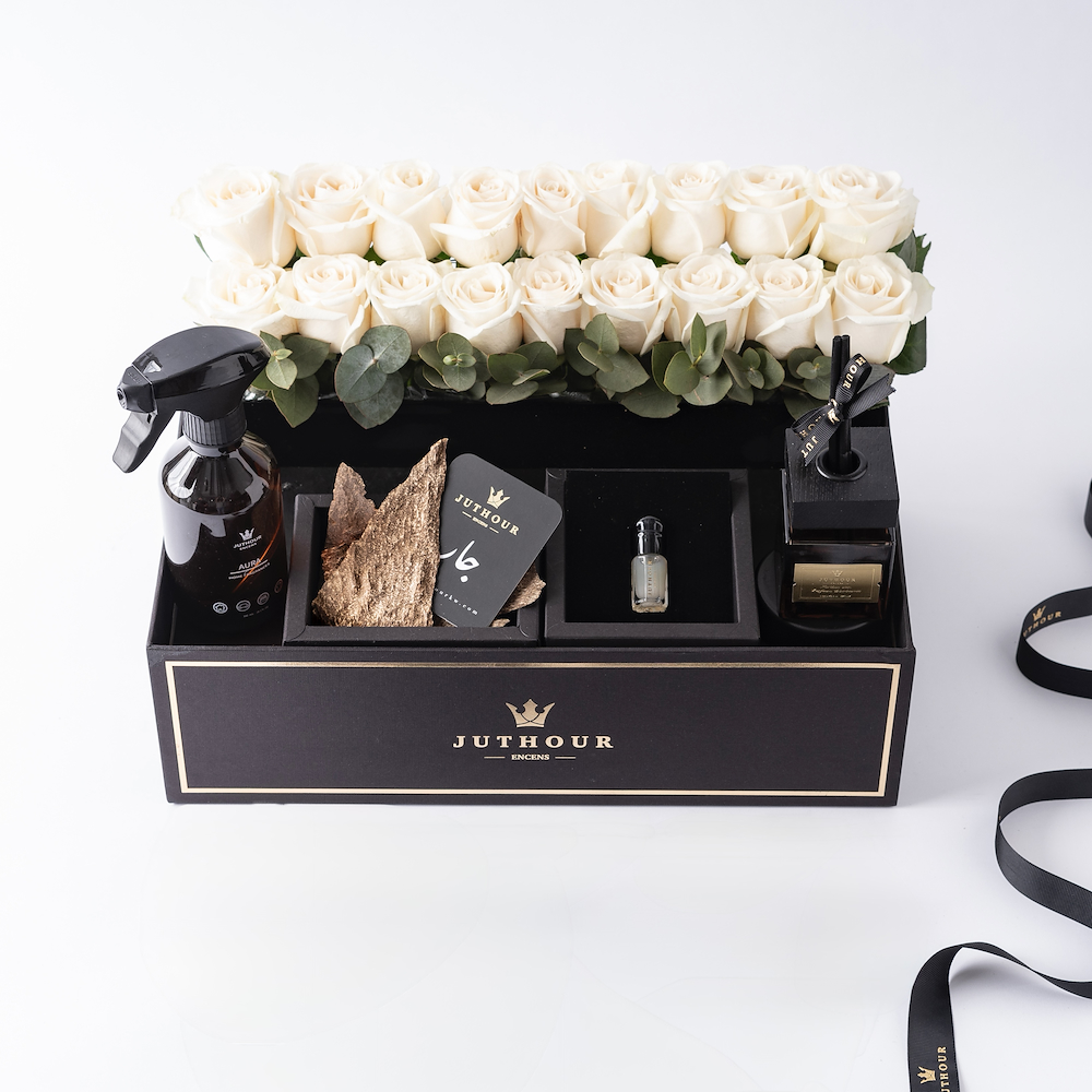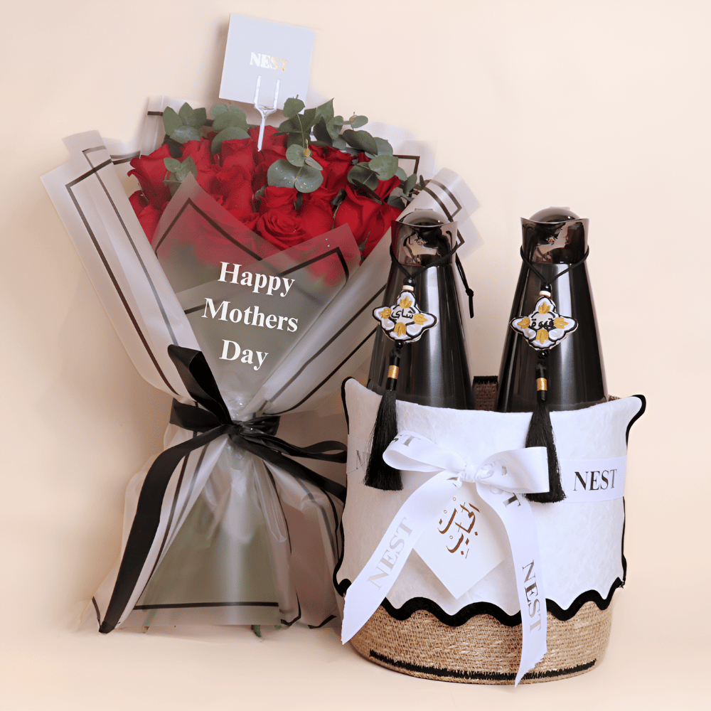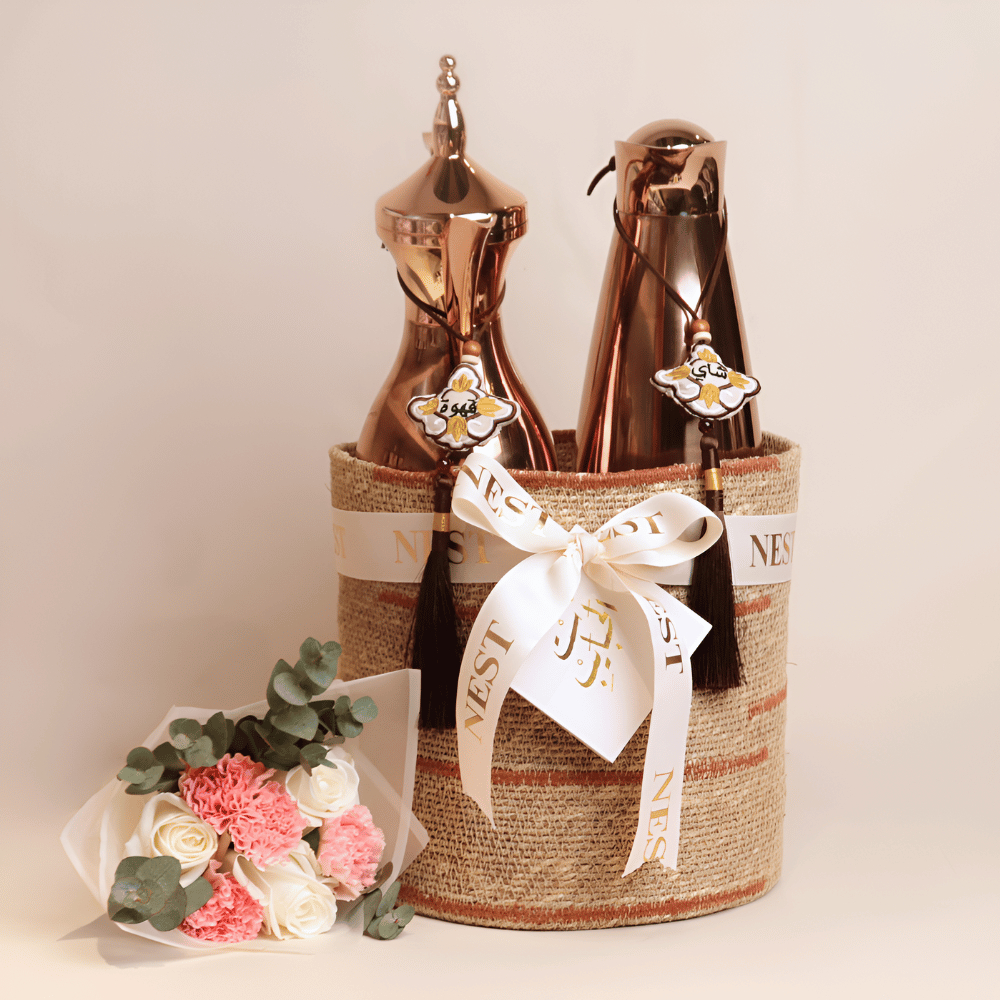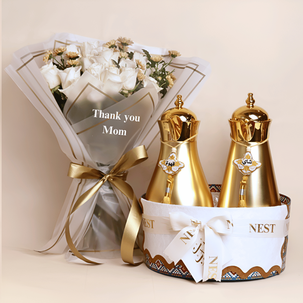 تحتوي الهدية على: - مطارتان ذهبيتان ملكيتان (سعة كل منهما 1 لتر). - الخامة: ستانلس ستيل 304. - يحفظ الحرارة لمدة 8 ساعات. - اللون: ذهبي. - شرابات قهوة وشاي ذهبية مطرزة. - سلة يدوية مخططة. - باقة يد من الجوري.