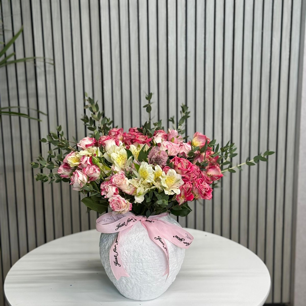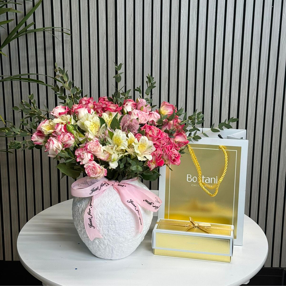 باقة البيبي روز مع كيكة الفانيلا الفاخرة من كانديرا بداخل بوكس شفاف.