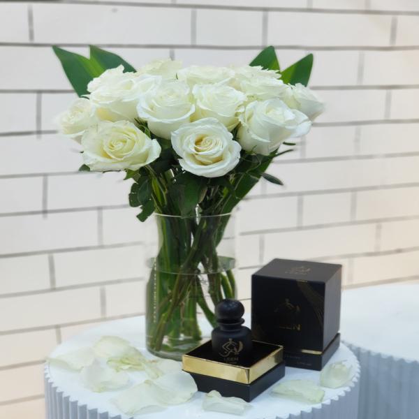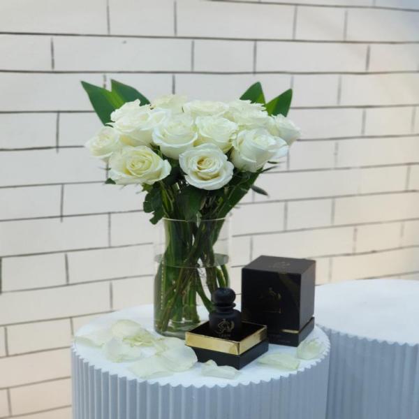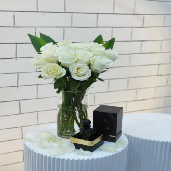 فازة مستديرة تحتوي على زهور الجوري مع عطر لين.