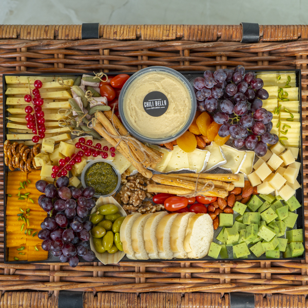 7 selection of cheese, Brie cheese, pesto cheese, Italian herb cheese, cumin cheese, partigiano cheese, white mature cheddar, sharp cheddar, with roasted garlic hummus, nuts and grapes.