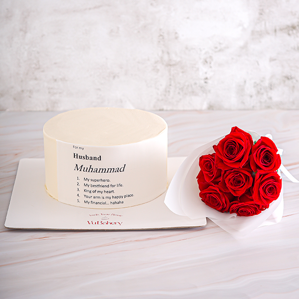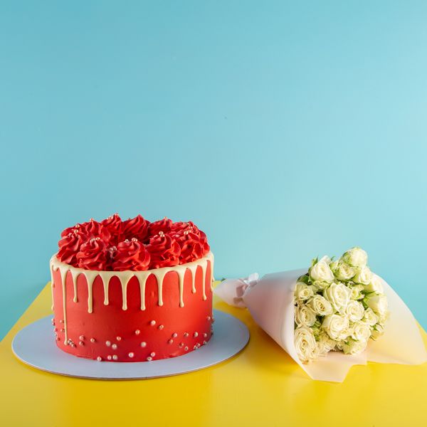 Layers of sponge cake filled with blueberry sauce coated with cream with a hand bouquet.