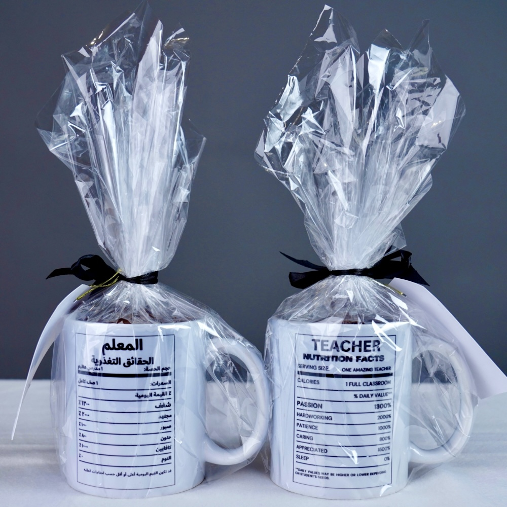 One English and one Arabic teachers facts mugs printed and filled with chocolate cake and Belgian chocolate ganache.