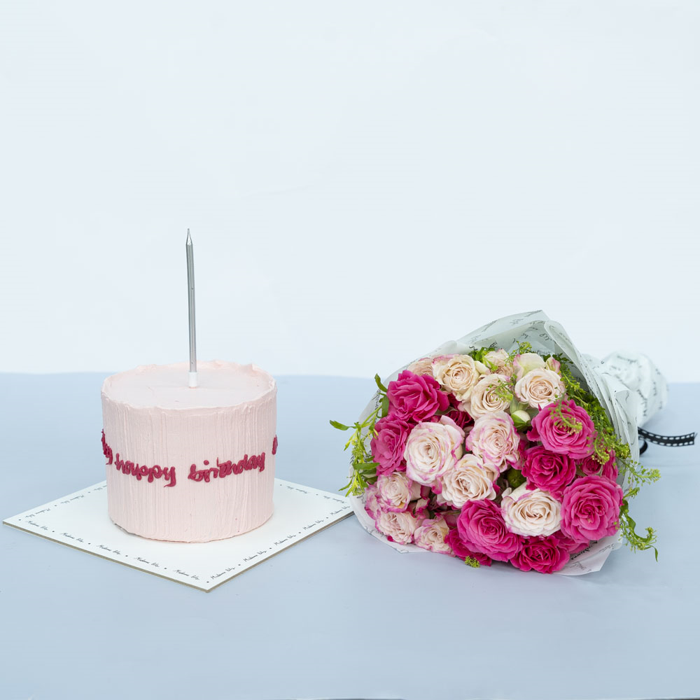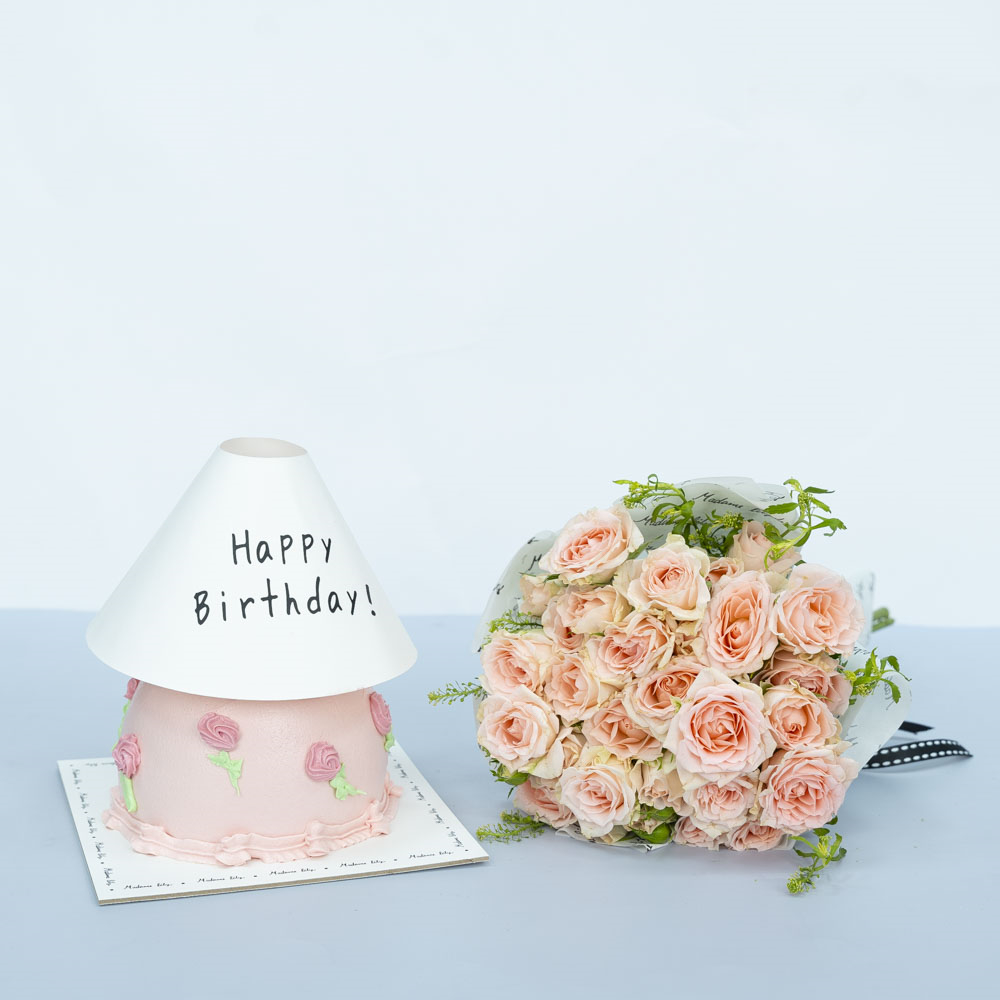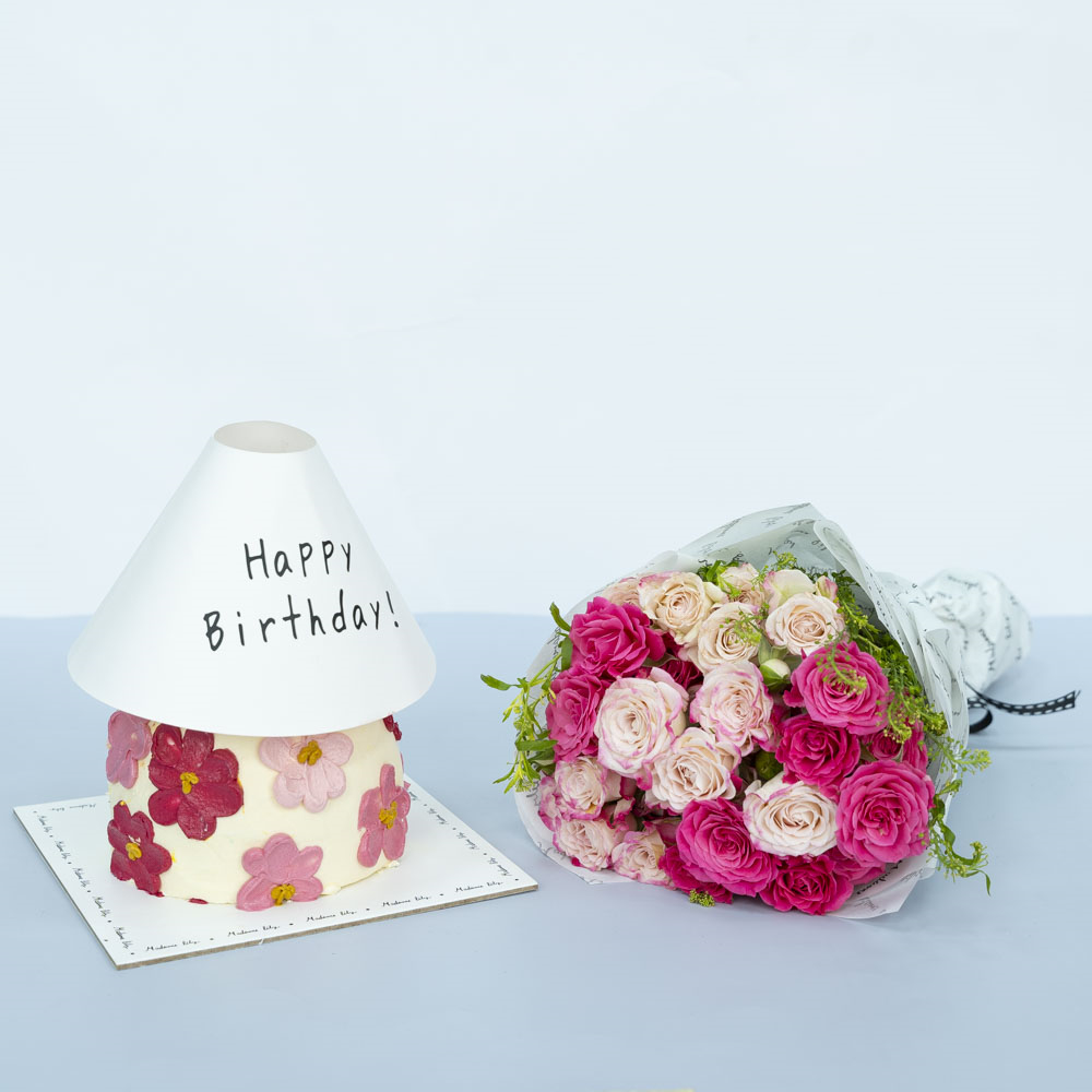 A tray of chocolates that contain white chocolate truffle, milk chocolate truffle, caramel marble, and special wafer, with a mix of flowers.