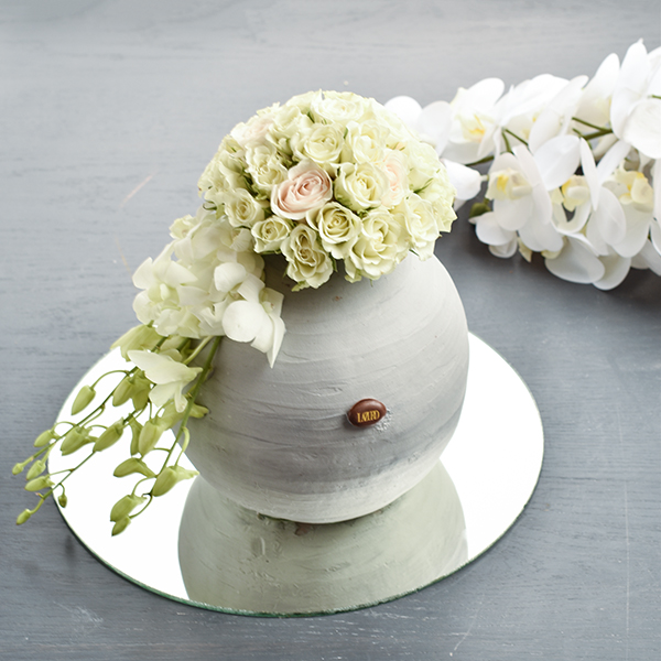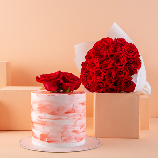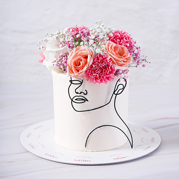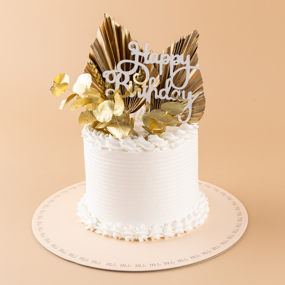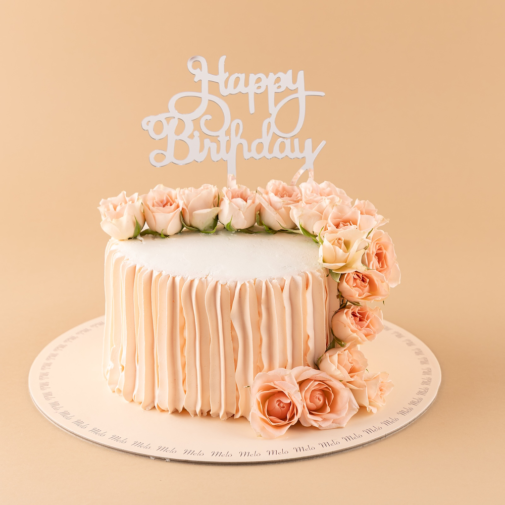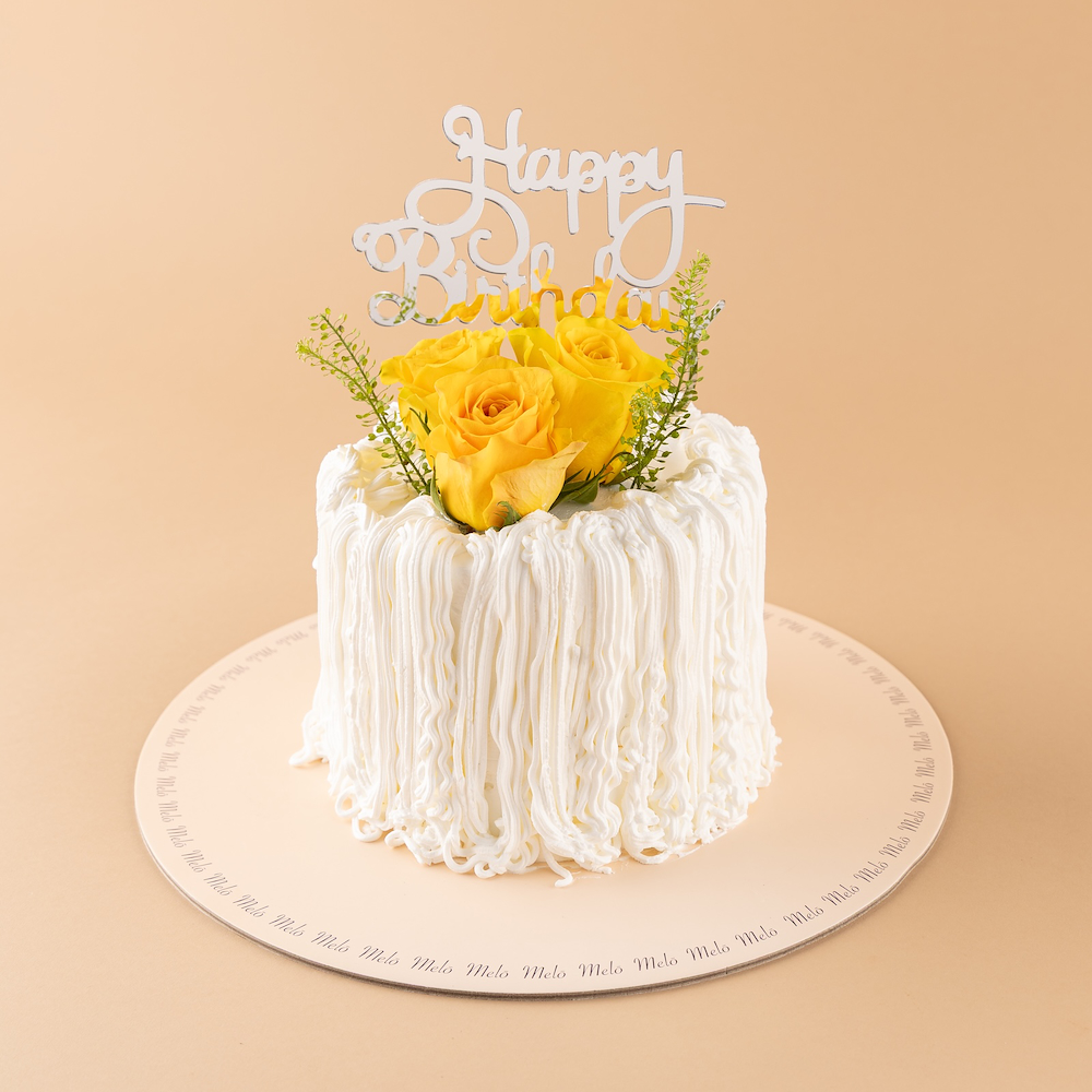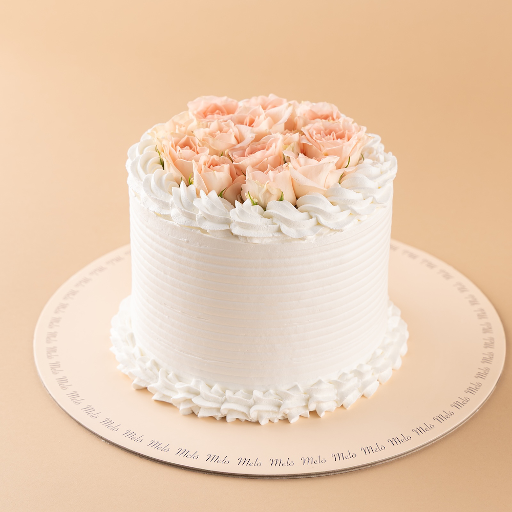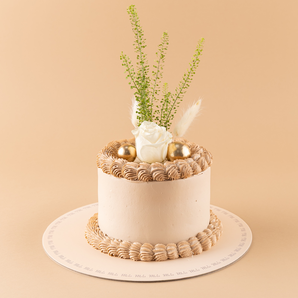 Melo vanilla cake decorated with a petal and a hand bouquet.