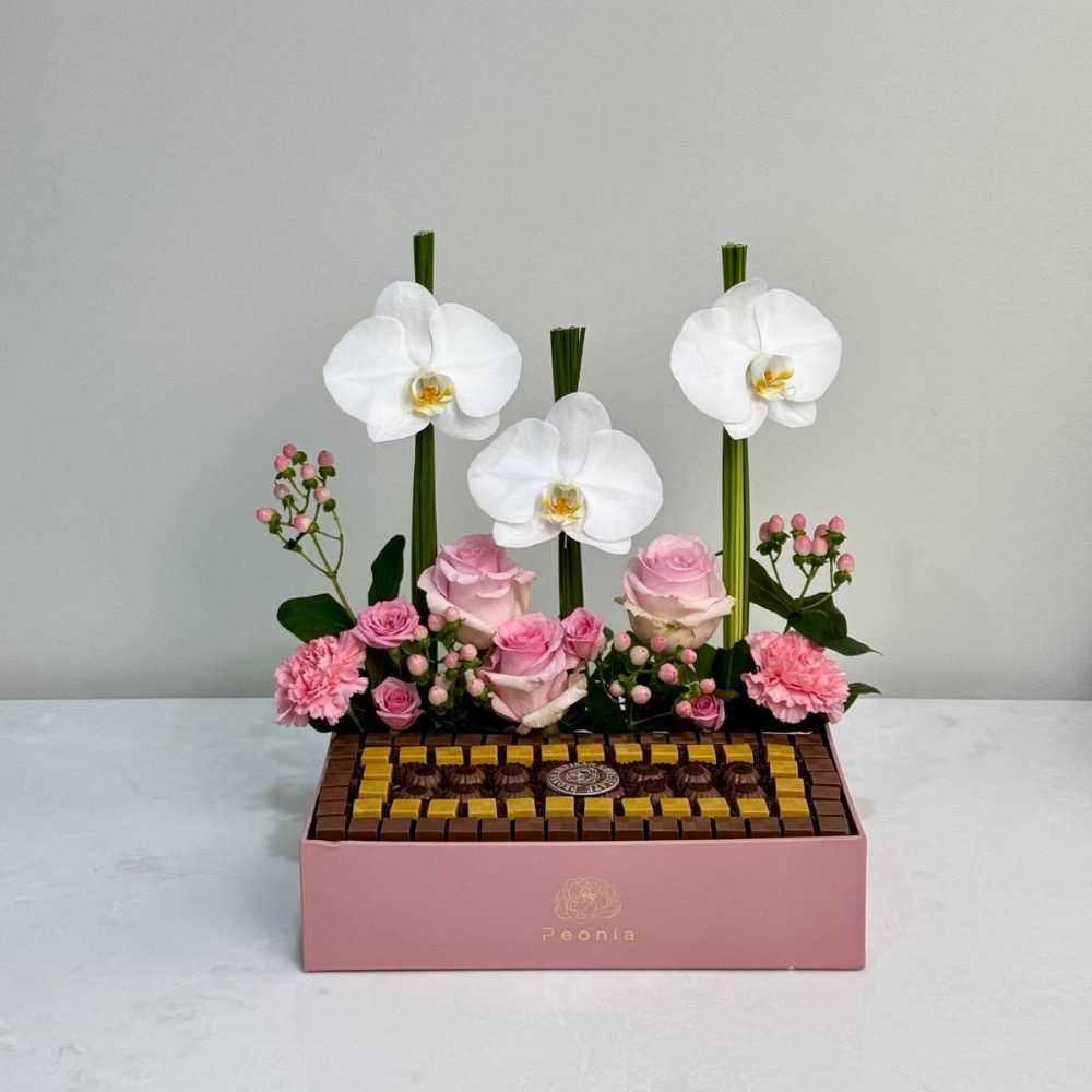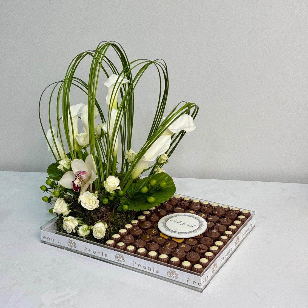 A stylish tray containing 800g of chocolates with flowers.