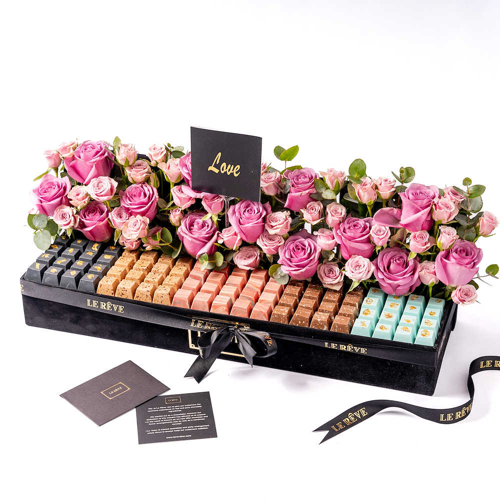 Royal Blue Classic Box with Roses that contains 1 Kilogram of mixed chocolates.