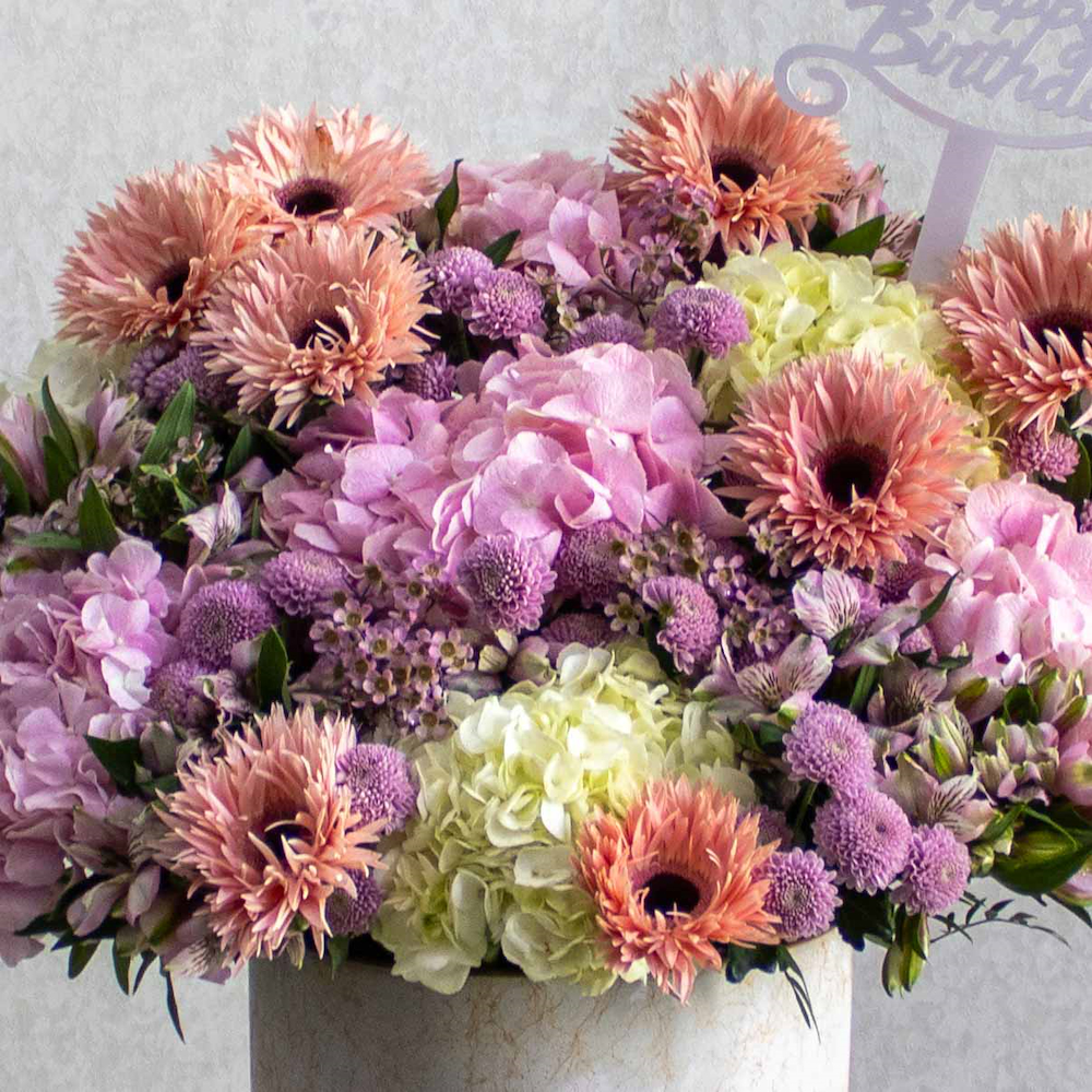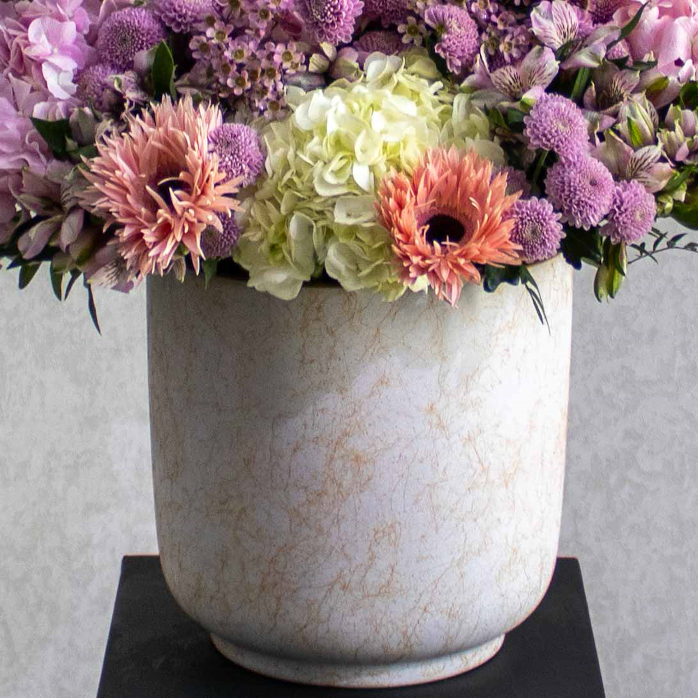 A ceramic vase beautifully arranged with alstroemeria, chrysanthemums, gerberas, and hydrangeas.