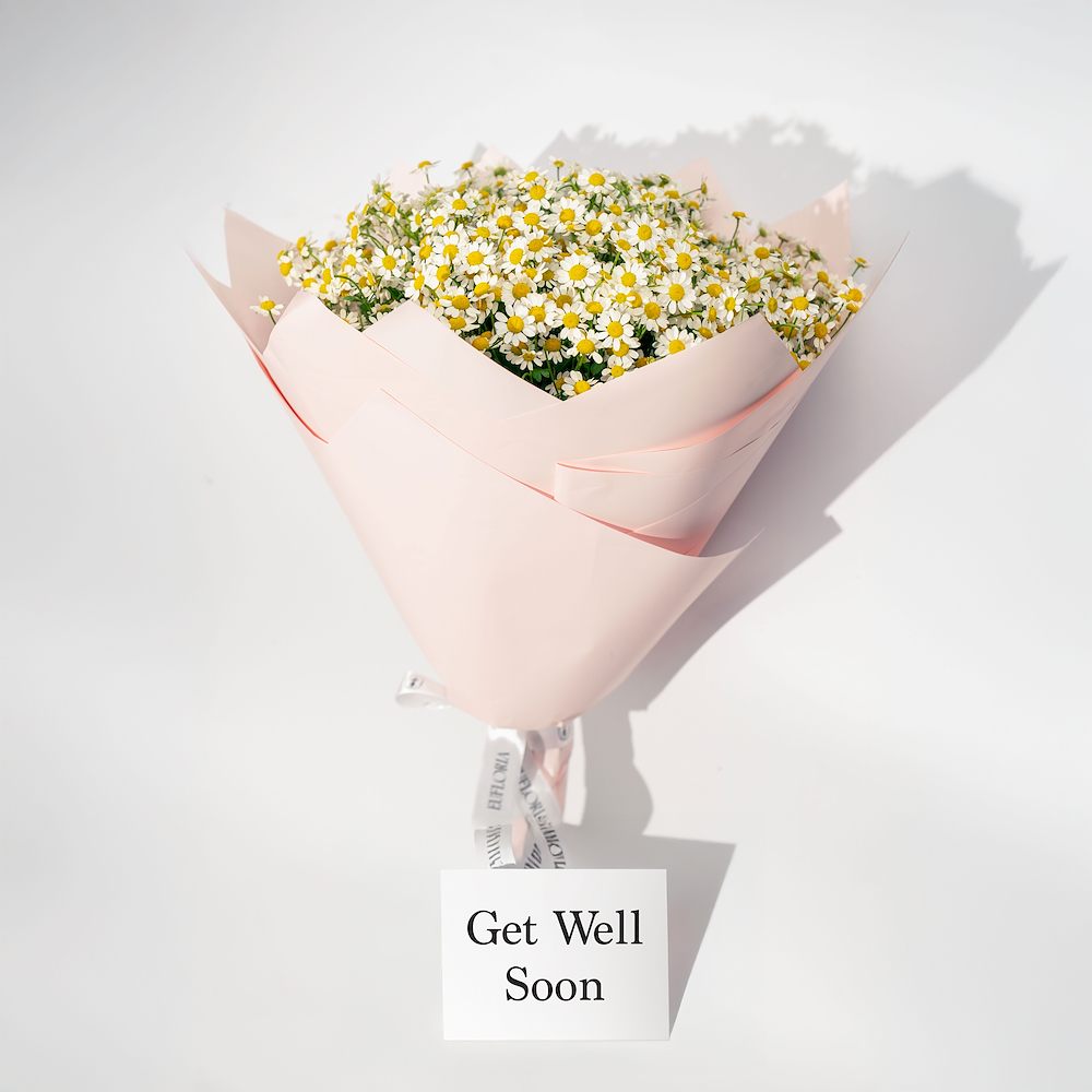 An vibrant bouquet with a special bag featuring 21 mini delicate chamomile flowers, bright, cheerful and full of energy.