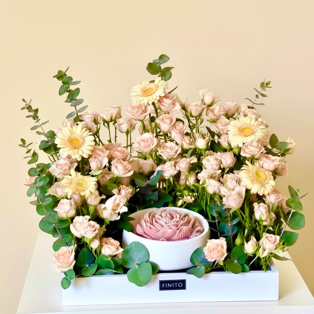 A beautifully arranged bouquet of roses, gerberas, and carnations in a tray.